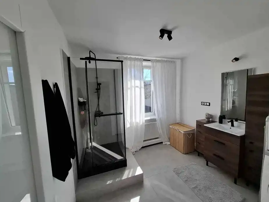Mieszkanie wyróżnia się jasnymi wnętrzami i dużymi oknami, które zapewniają naturalne światło przez cały dzień.