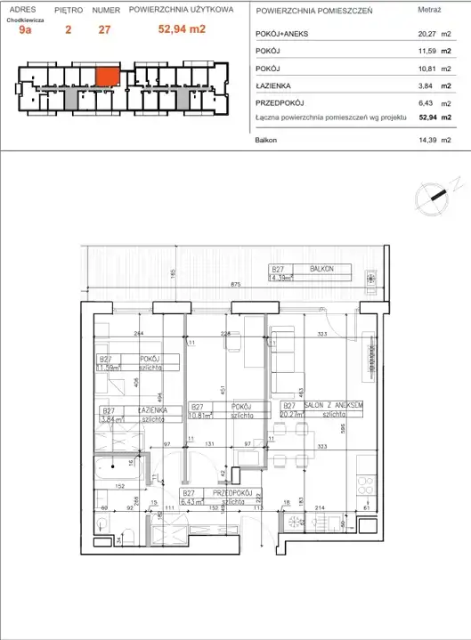 - Charakterystyka mieszkania 52.94 m2, 3 pokoje