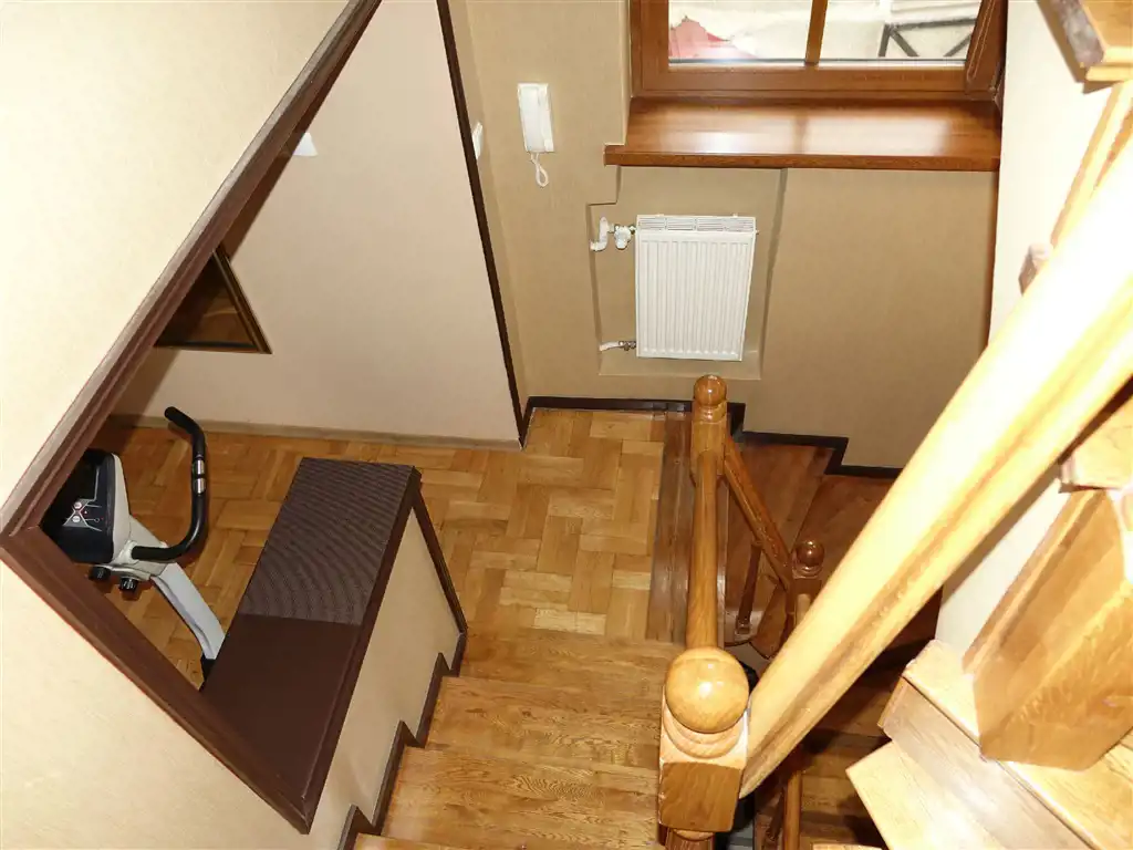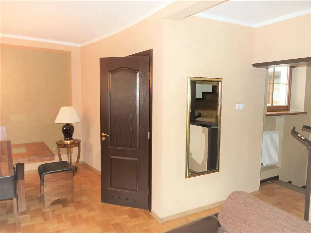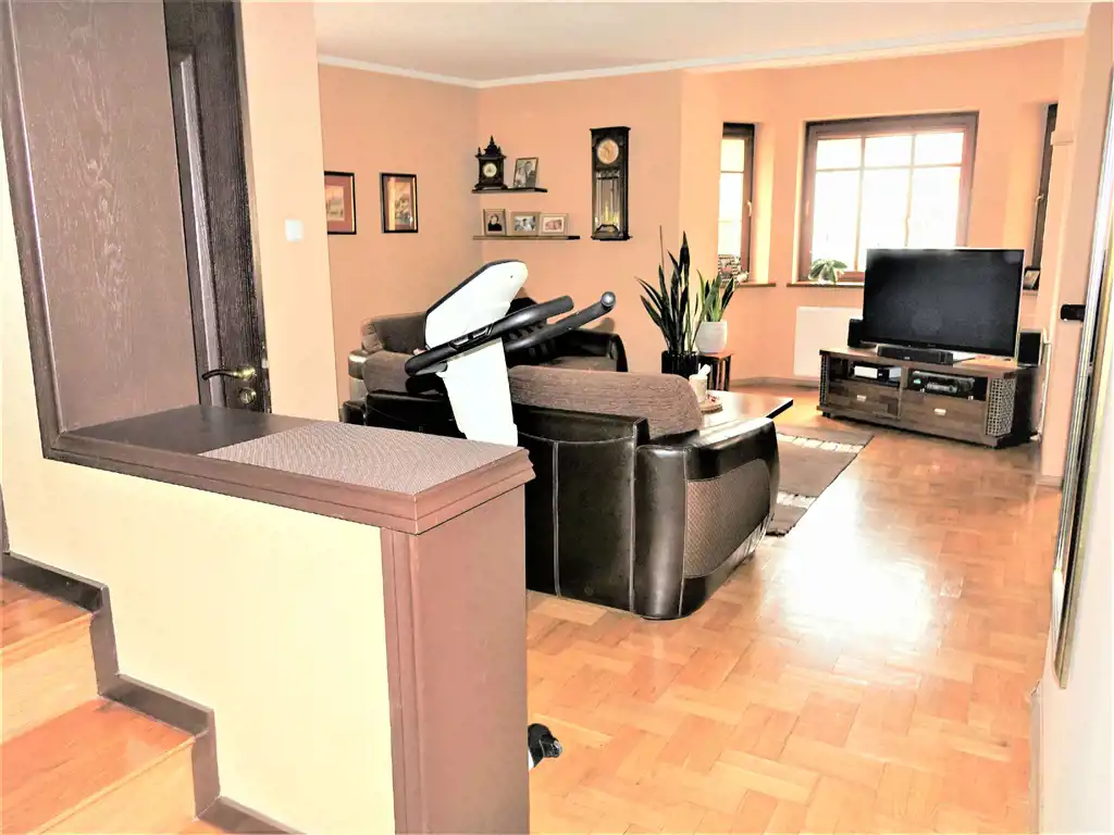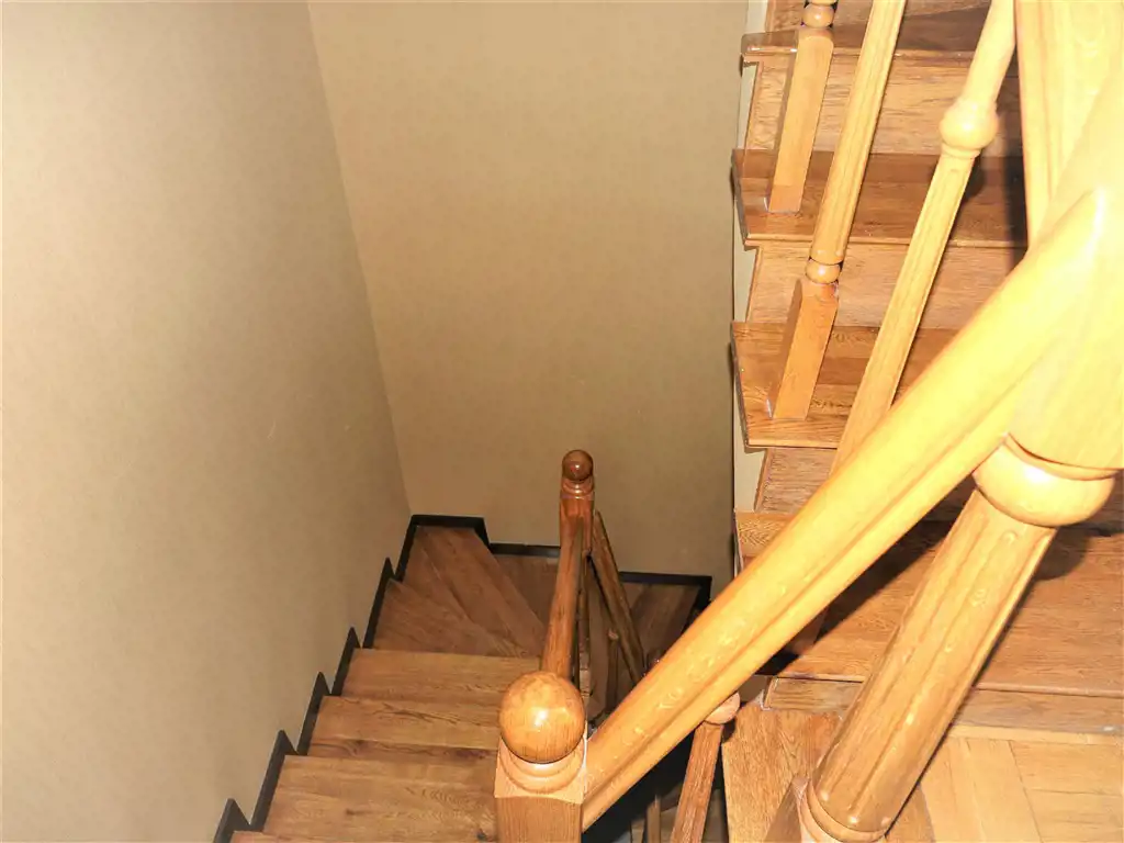 Poziom - I piętro - klatka schodowa - schody dębowe zadbane - przedpokój, salon z częściowo wydzieloną za stołem część jadalniana o pow. 34m2. sypialnia o pow. 8,5m2., łazienka z wc 3,5m2.. korytarz.
