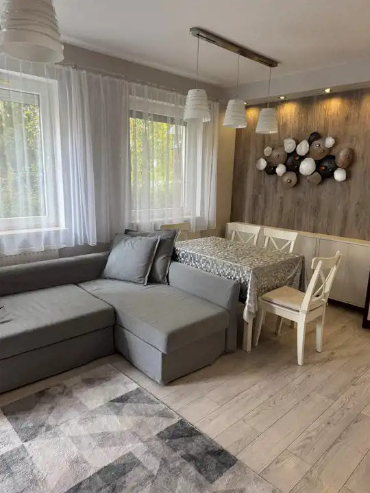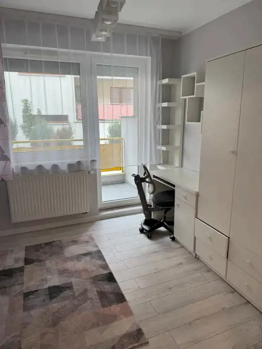 Kuchnia w nowoczesnej zabudowie w pełni wyposażona -lodówka, zmywarka, płyta indukcyjna, okap, mikrofalówka, pralka, telewizor. W łazience i WC nowa armatura .Posiada rolety antywłamaniowe sterowane pilotem. A tyłu budynku znajduje się dodatkowy parking oraz plac zabaw dla dzieci . Blok ogrodzony.