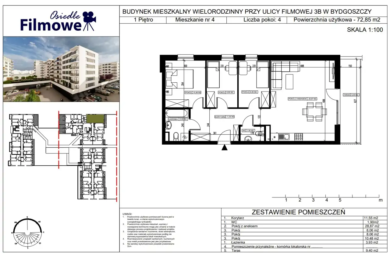- Charakterystyka mieszkania 72.85 m2, 4 pokoje