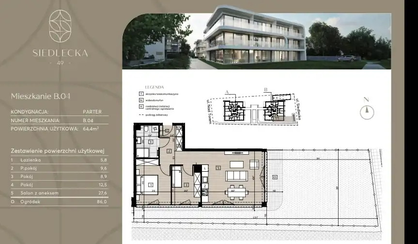 W ramach inwestycji powstaną dwa eleganckie, niskokondygnacyjne budynki, które pomieszczą łącznie 37 komfortowych apartamentów o powierzchniach od 37 m² do 105 m². Mieszkania na parterze będą wyposażone w prywatne ogródki, idealne do relaksu na świeżym powietrzu, natomiast lokale na piętrach zyskają przestronne tarasy z nowoczesnymi szklanymi balustradami.