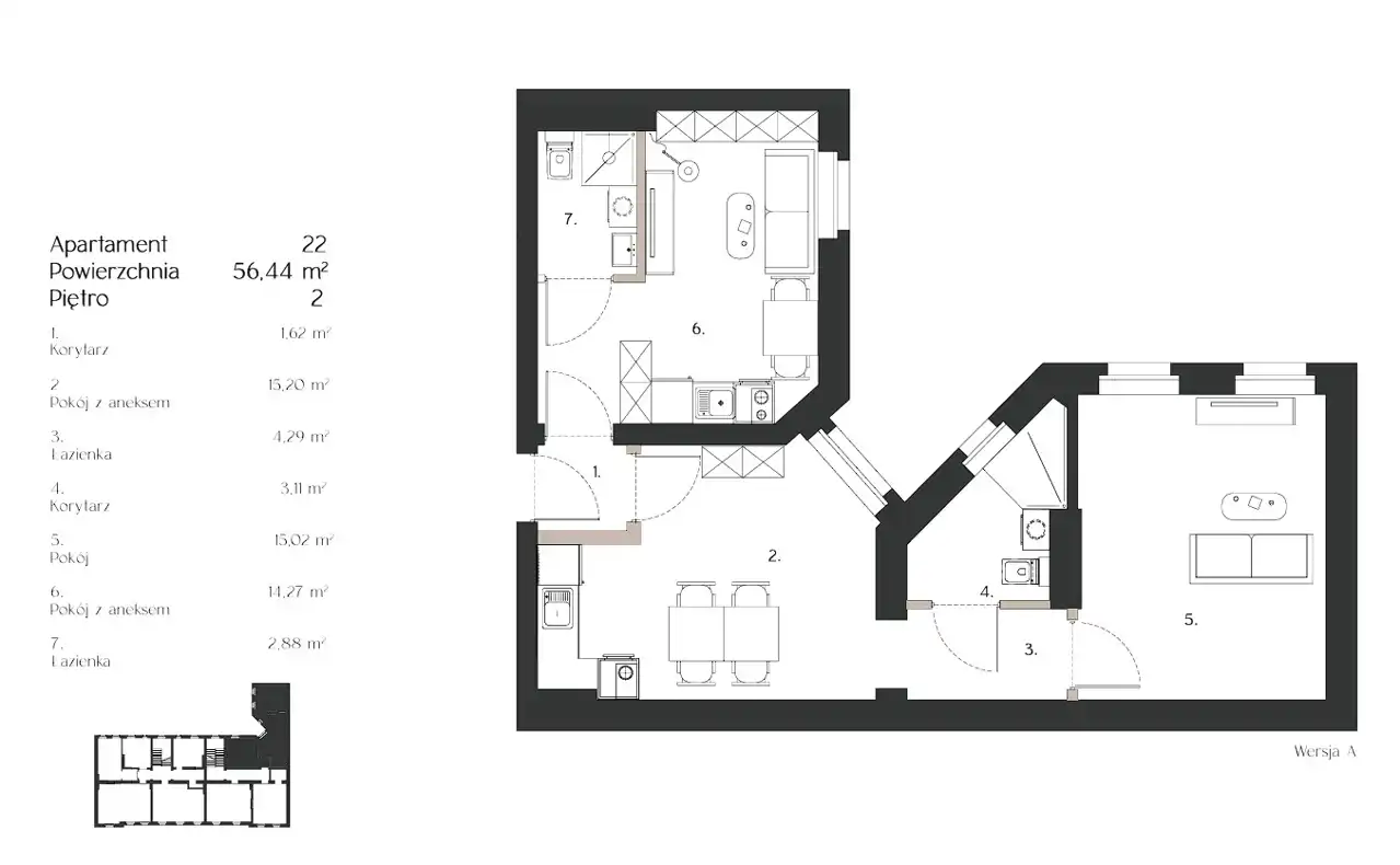 - Charakterystyka mieszkania 56.44 m2, 2 pokoje