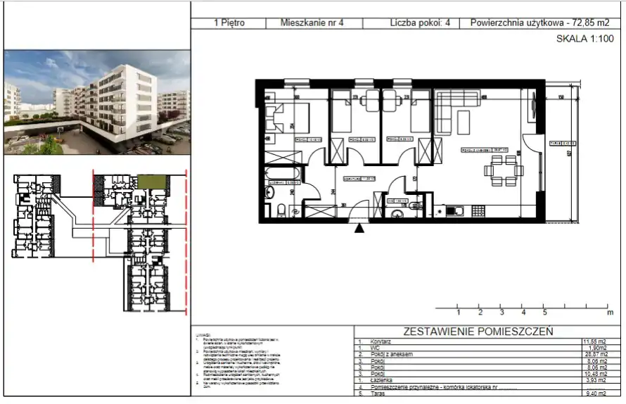 - Charakterystyka mieszkania 72.85 m2, 4 pokoje