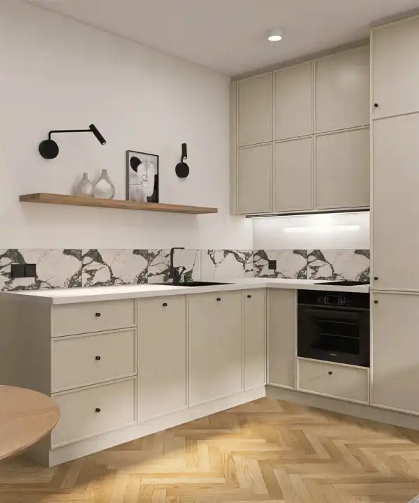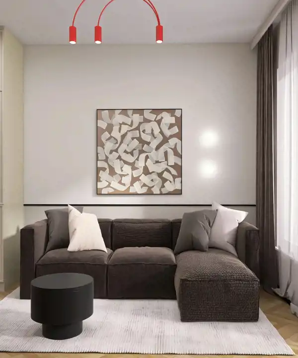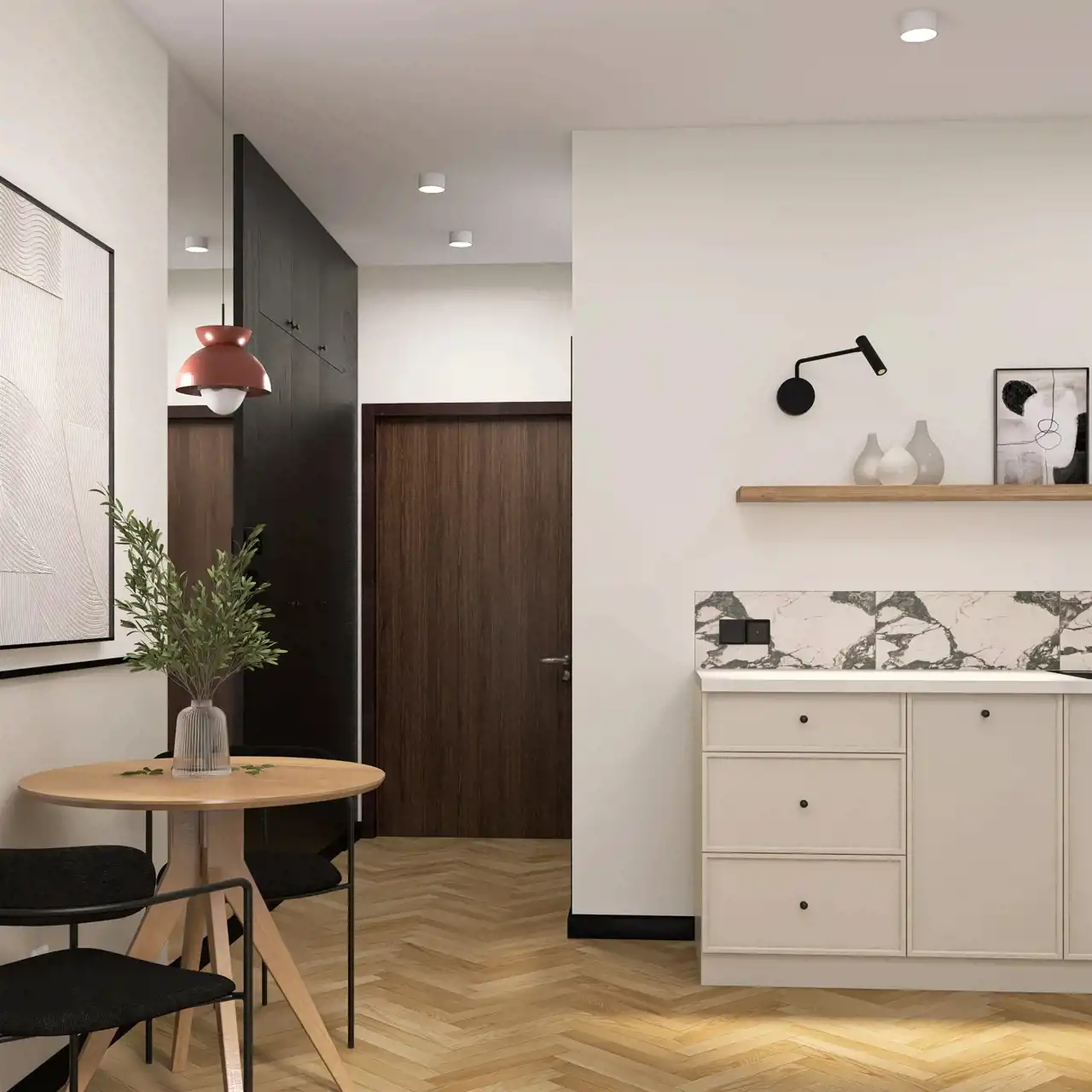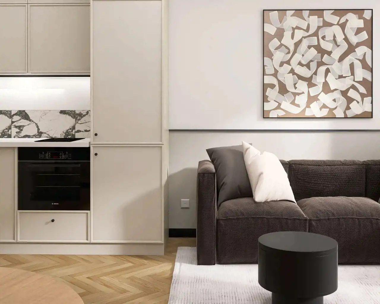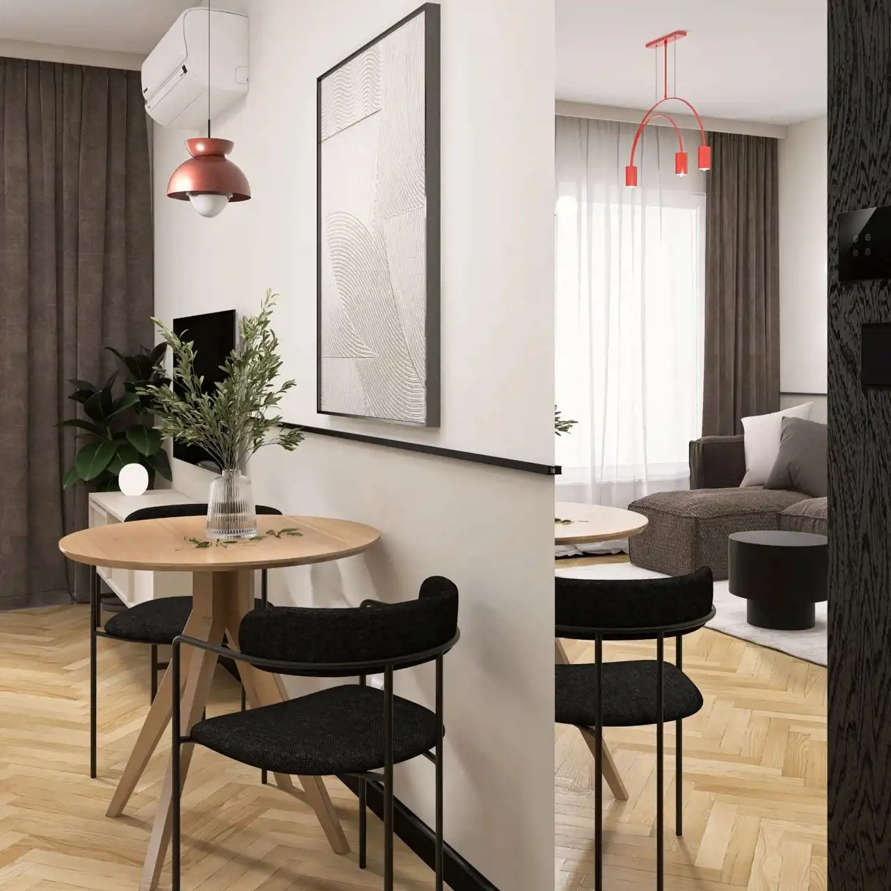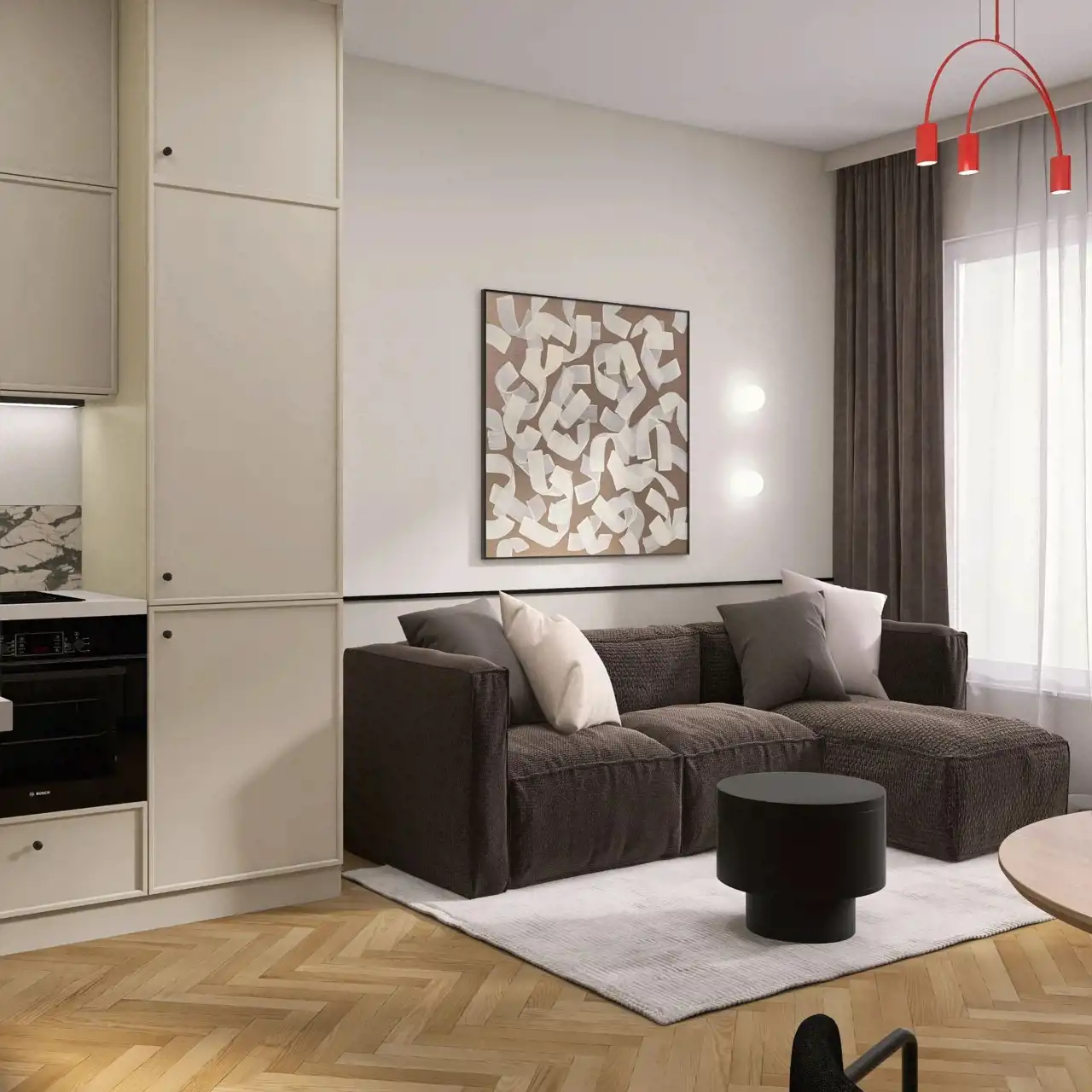 - Nowoczesnego salonu z aneksem kuchennym – serce mieszkania, w którym funkcjonalność spotyka się z designem. Otwarta przestrzeń dzienna zapewnia mnóstwo światła i swobody, a kuchnia wyposażona we wszystkie niezbędne sprzęty AGD umożliwia komfortowe przygotowywanie posiłków.
