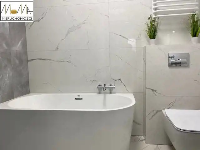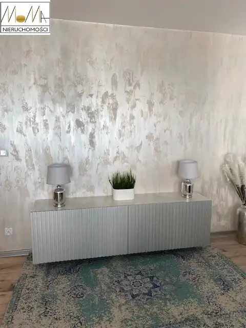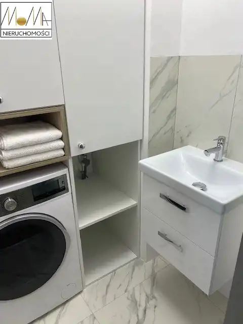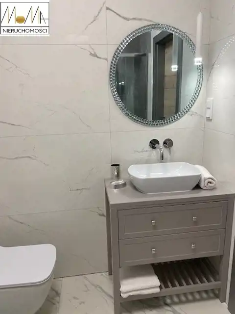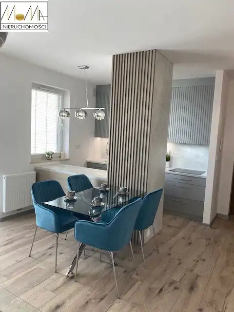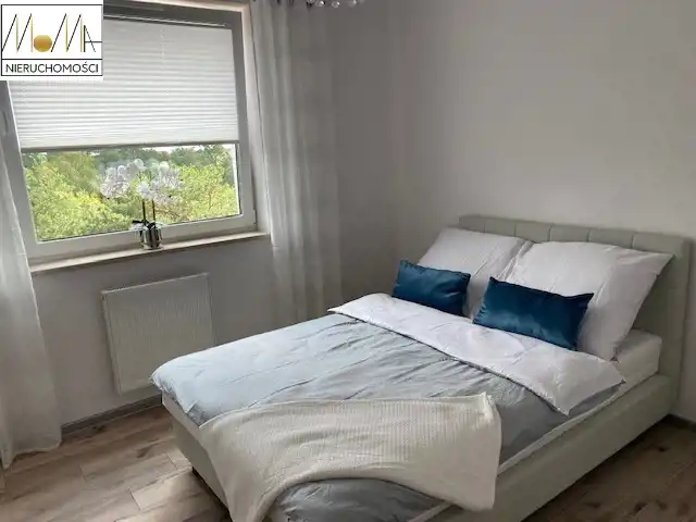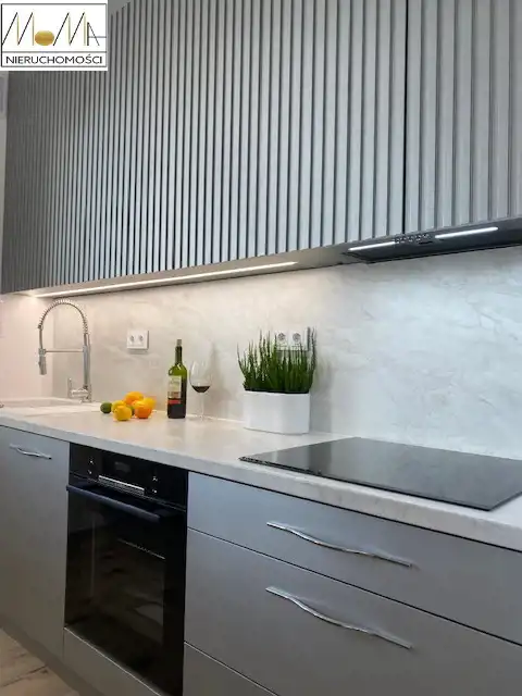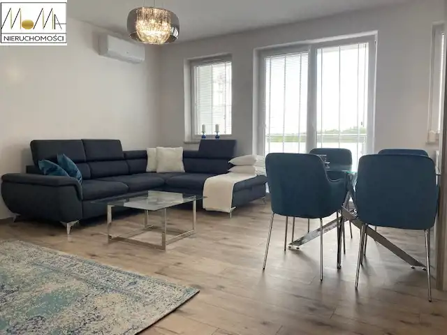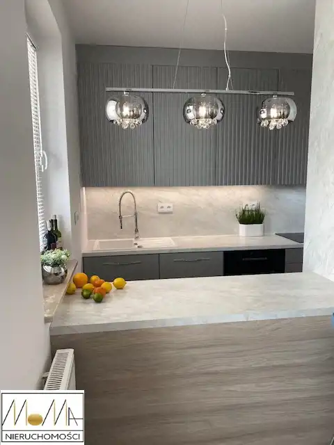 Mieszkanie ma 66 m2 i składa się z salonu z aneksem kuchennym 29 m2, sypialni 13 m2, pokoju 11 m2, łazienki 5 m2, pralni z pralko-suszarką 3 m2 korytarza oraz balkonu 12 m2. Gustownie urządzona kuchnia w kolorze szarym z białym blatem wyposażona jest w sprzęt AGD (piekarnik, płyta indukcyjna, okap kuchenny, lodówka, zmywarka) doskonale komponuje się z otwartym salonem co tworzy przytulne nowoczesne wnętrze. Nowoczesna łazienka wyposażona jest w prysznic z deszczownicą, wannę wolnostojącą. Podłogi w mieszkaniu są w jednolitym drewnianym kolorze. W korytarzu duża szafa w zabudowie. Mieszkanie znajduje się w nowopowstałym (2022r.) budynku z cichobieżną windą z poziomu garażu, w bliskiej odległości sklepy, szkoły, przedszkola oraz komunikacja miejska, szpital, dworzec.