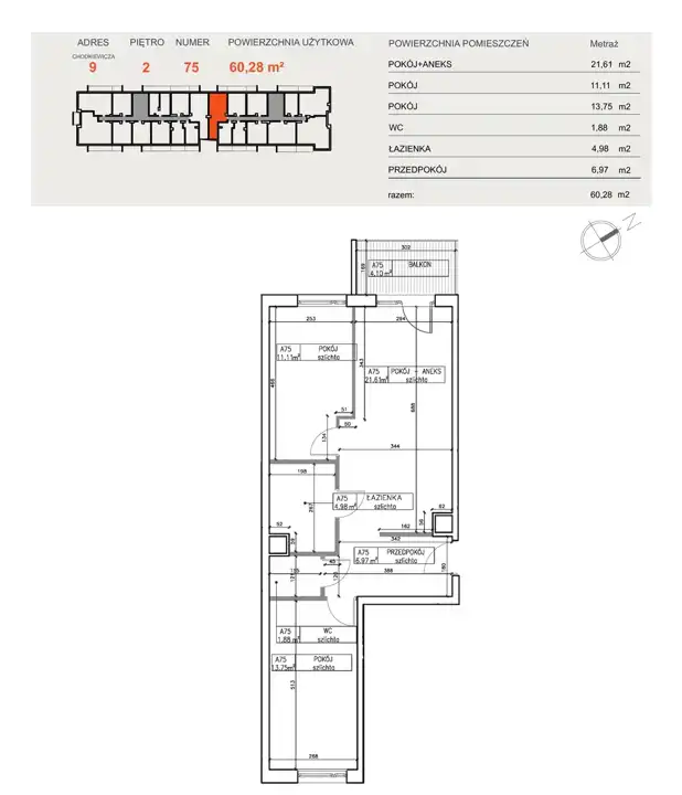 Mieszkanie o powierzchni 60,28 m2 składa się z: