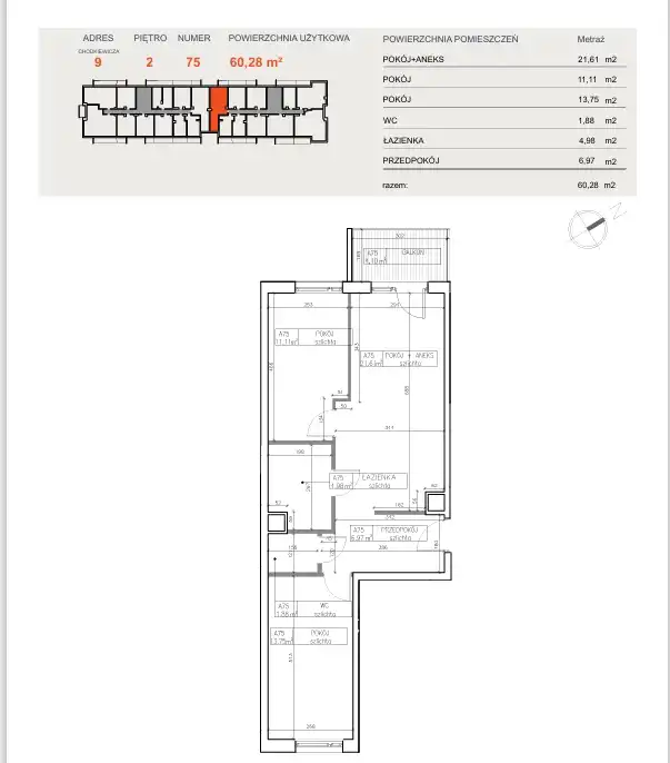 Powierzchnia użytkowa o metrażu 60,28 m² obejmuje:
