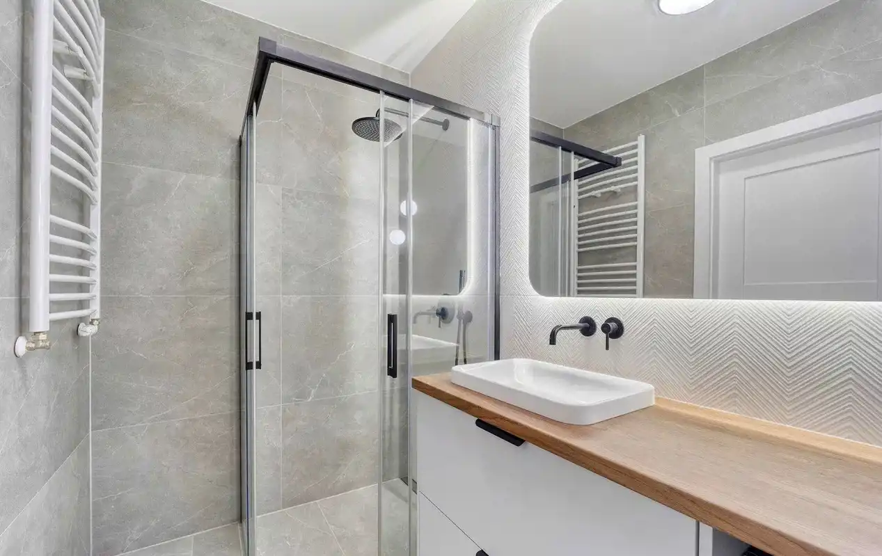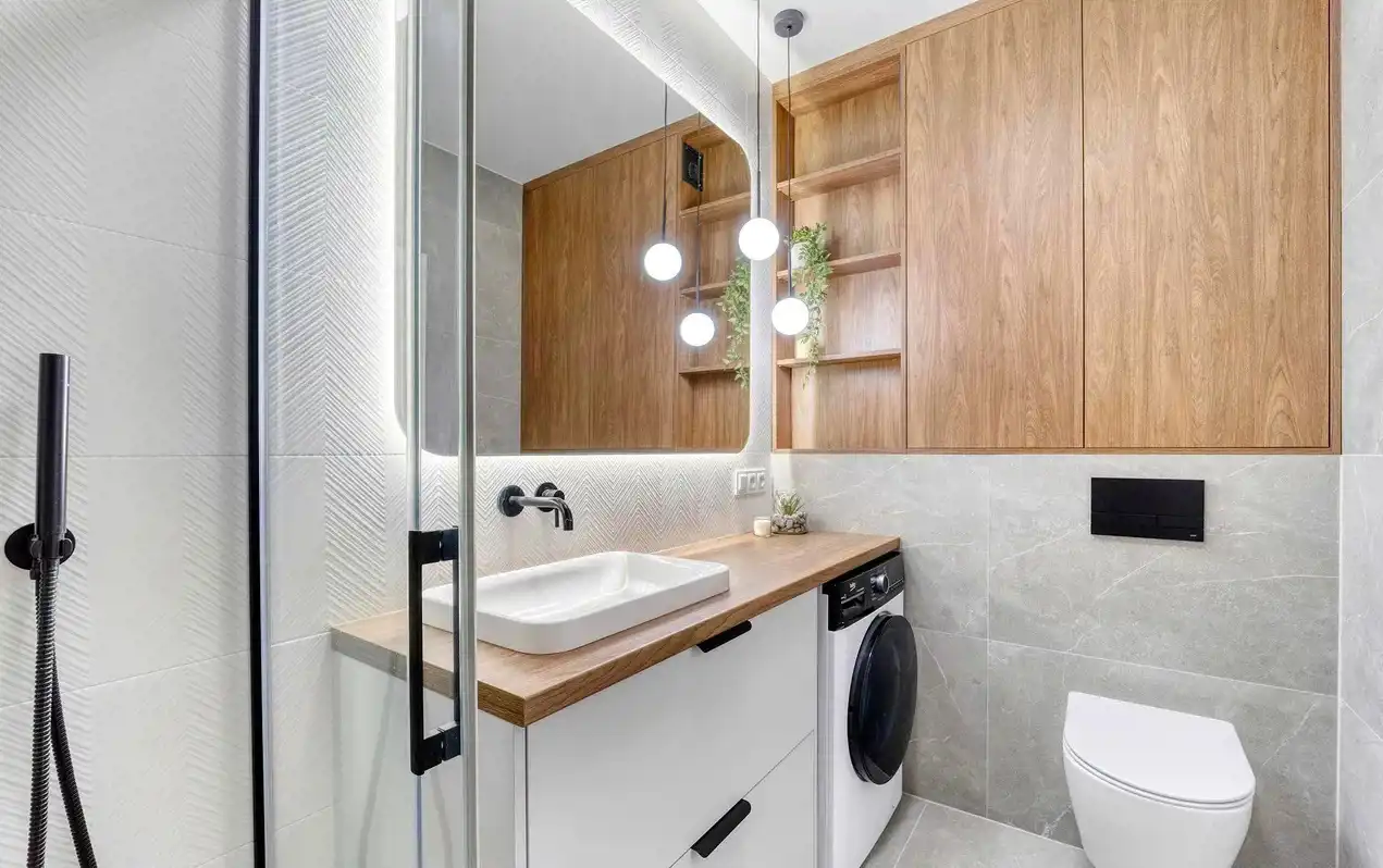 Wykończona w standardzie premium. Duże płytki o strukturze kamienia, czarna armatura, podświetlane lustro oraz zabudowy stolarskie tworzą nowoczesną i elegancką całość. Komfort użytkowania podnosi prysznic typu walk-in, ogrzewanie podłogowe oraz pralko-suszarka.