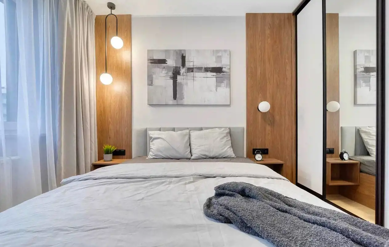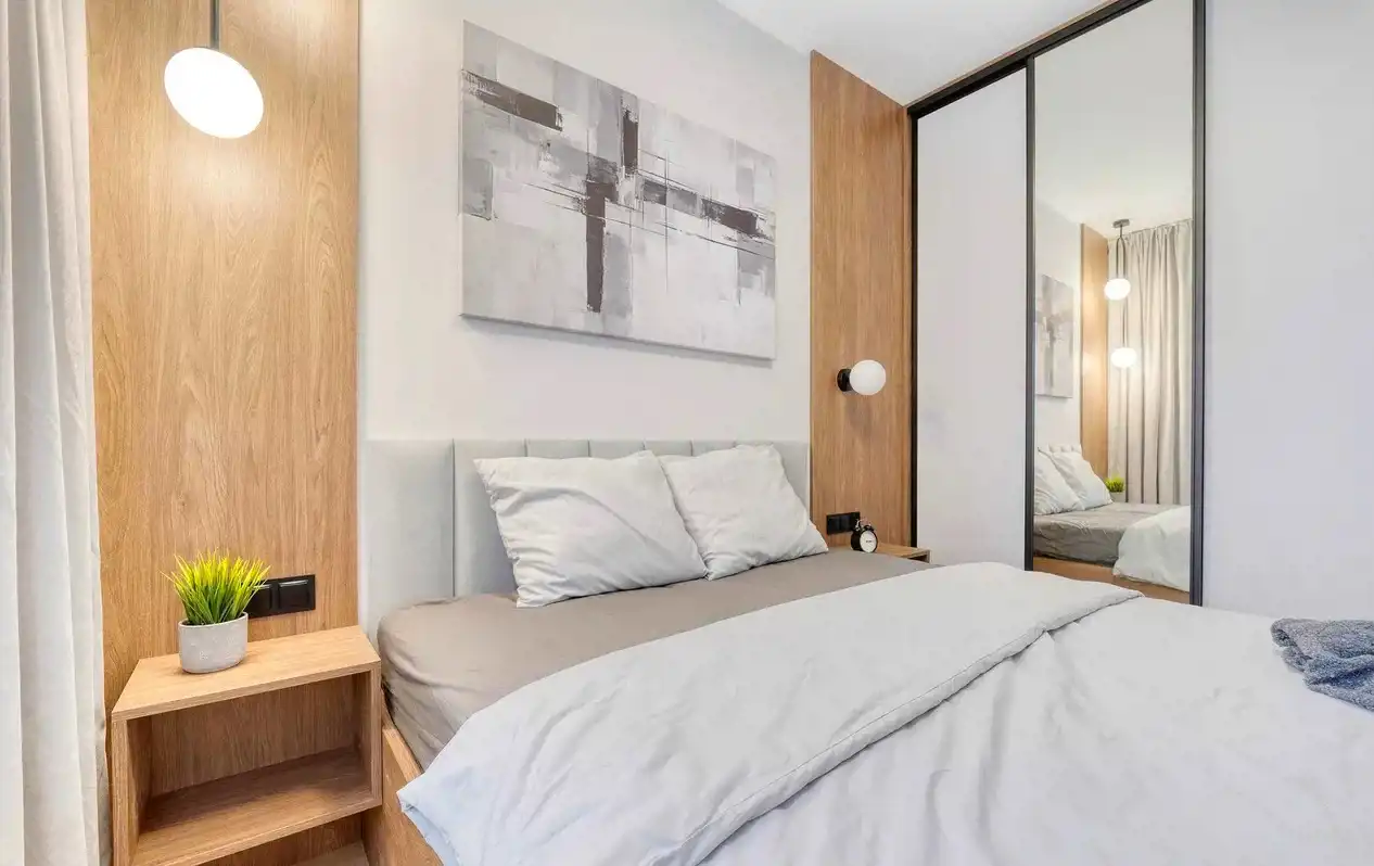 Przemyślana i przytulna przestrzeń sprzyjająca wypoczynkowi. Tapicerowane łóżko z podnoszonym stelażem, pojemna szafa wykonana na wymiar oraz stonowana paleta barw tworzą harmonijną, spokojną atmosferę.