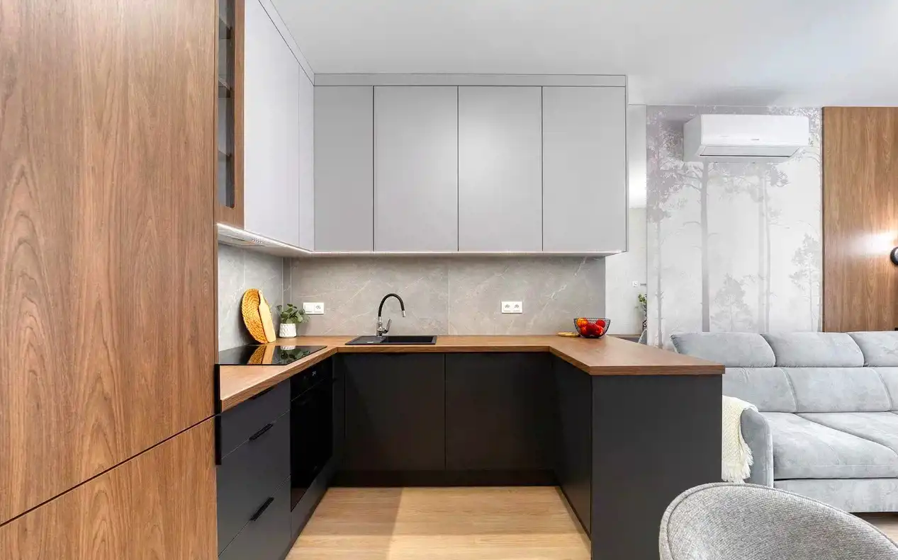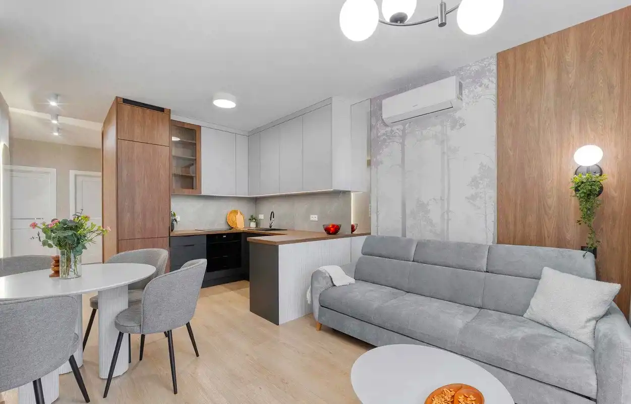 Elegancka i spójna przestrzeń dzienna, zaprojektowana z dbałością o każdy detal. Kuchnia wykonana na wymiar łączy jasne, minimalistyczne fronty z naturalnym drewnem oraz subtelną strukturą kamienia. Zabudowa została uzupełniona o sprzęt AGD w zabudowie, podświetlenia LED oraz ergonomiczne rozwiązania, które podnoszą komfort użytkowania.