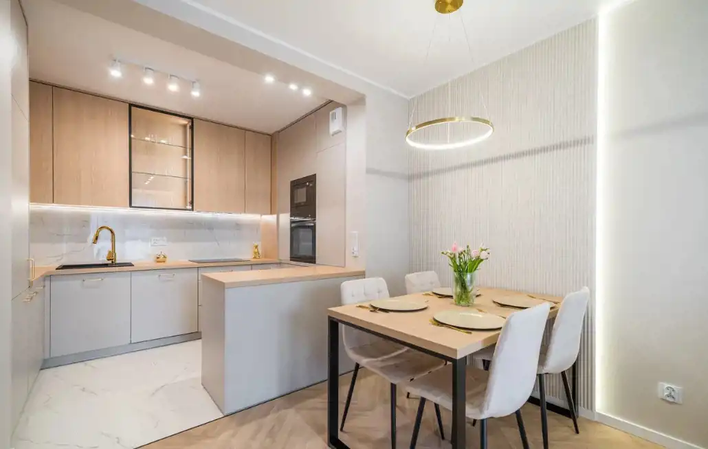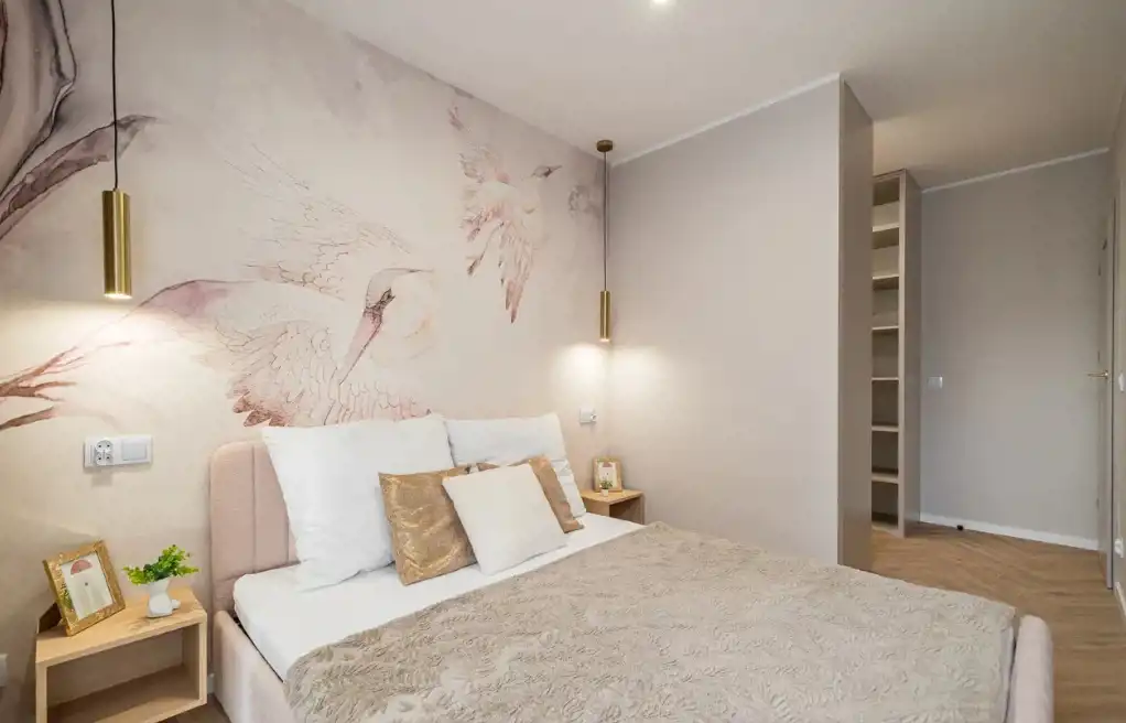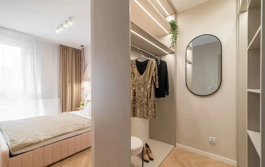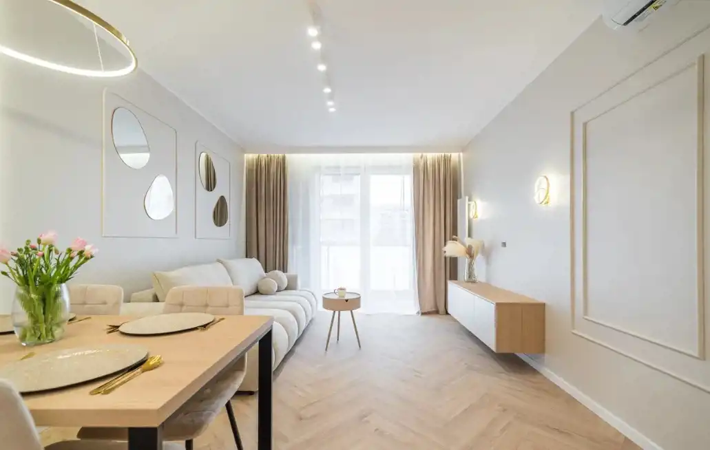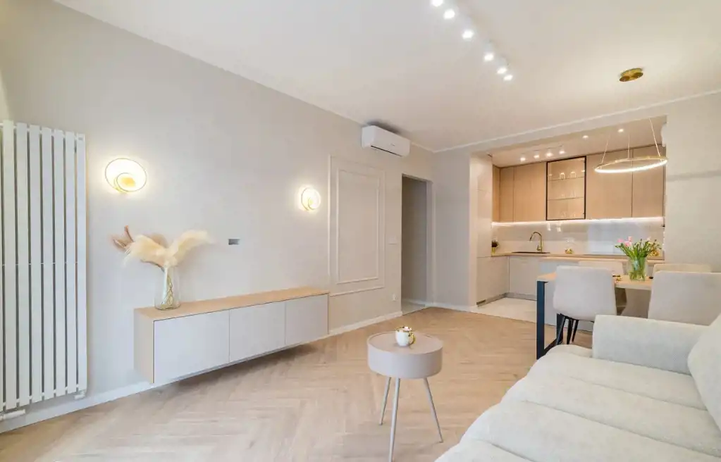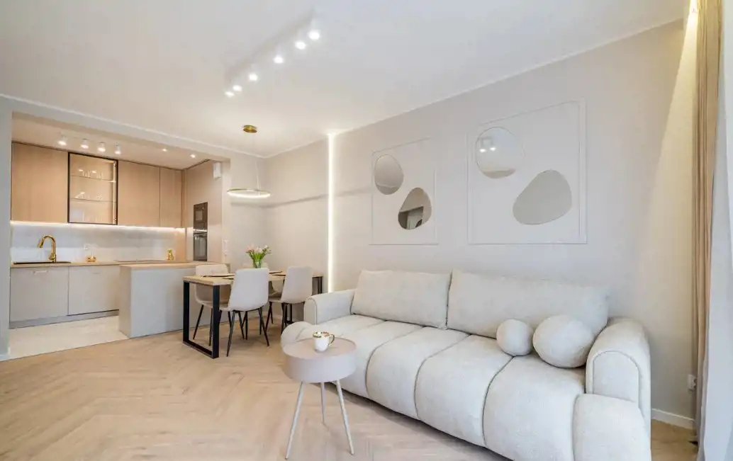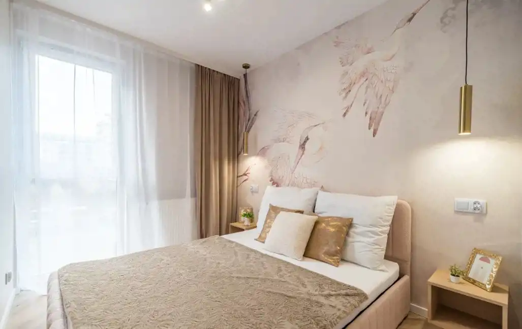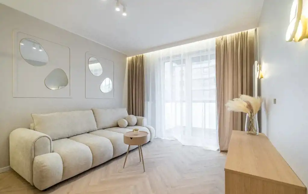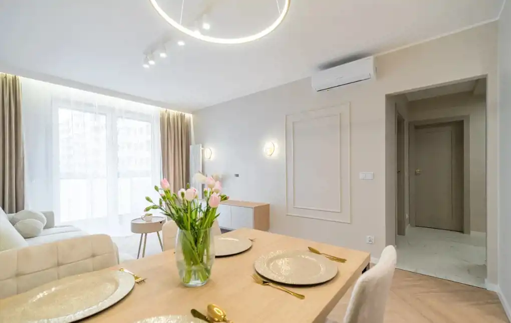 W skład mieszkania wchodzi: przestrzenny salon z wydzielonym aneksem kuchennym 25m2, dwa pokoje (sypialnia 13,5m2, pokój 10m2- idealny jako pokój dziecięcy, gabinet lub pokój gościnny) oraz łazienka 5,m2. , wysoki parter z balkonem. Mieszkanie umeblowane w zabudowy stolarskie wykonane na wymiar - stół, krzesła, sofa z funkcją spania, łóżko 160cm z pojemnikiem na pościel, stoliki nocne, stolik kawowy, lustra. Baterie renomowanej firmy Grohe, klimatyzacja, drzwi DRE, nowoczesne oświetlenie, łazienka z wanną!