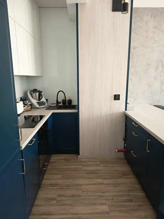 Zastosowano meble wykonane na wymiar, które maksymalnie wykorzystują przestrzeń i podkreślają nowoczesny charakter wnętrza.