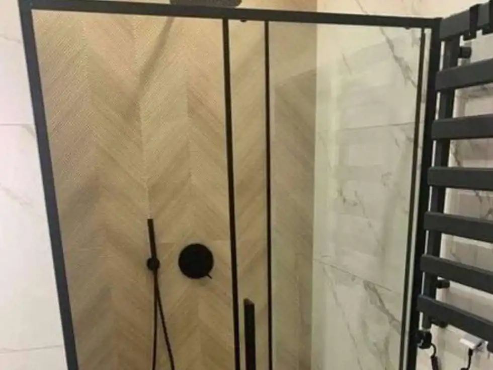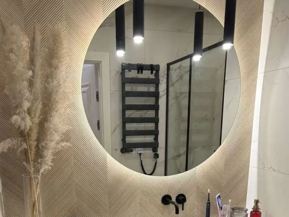 • nowoczesna łazienka z dużym lustrem i zabudową