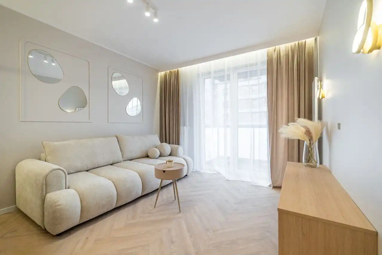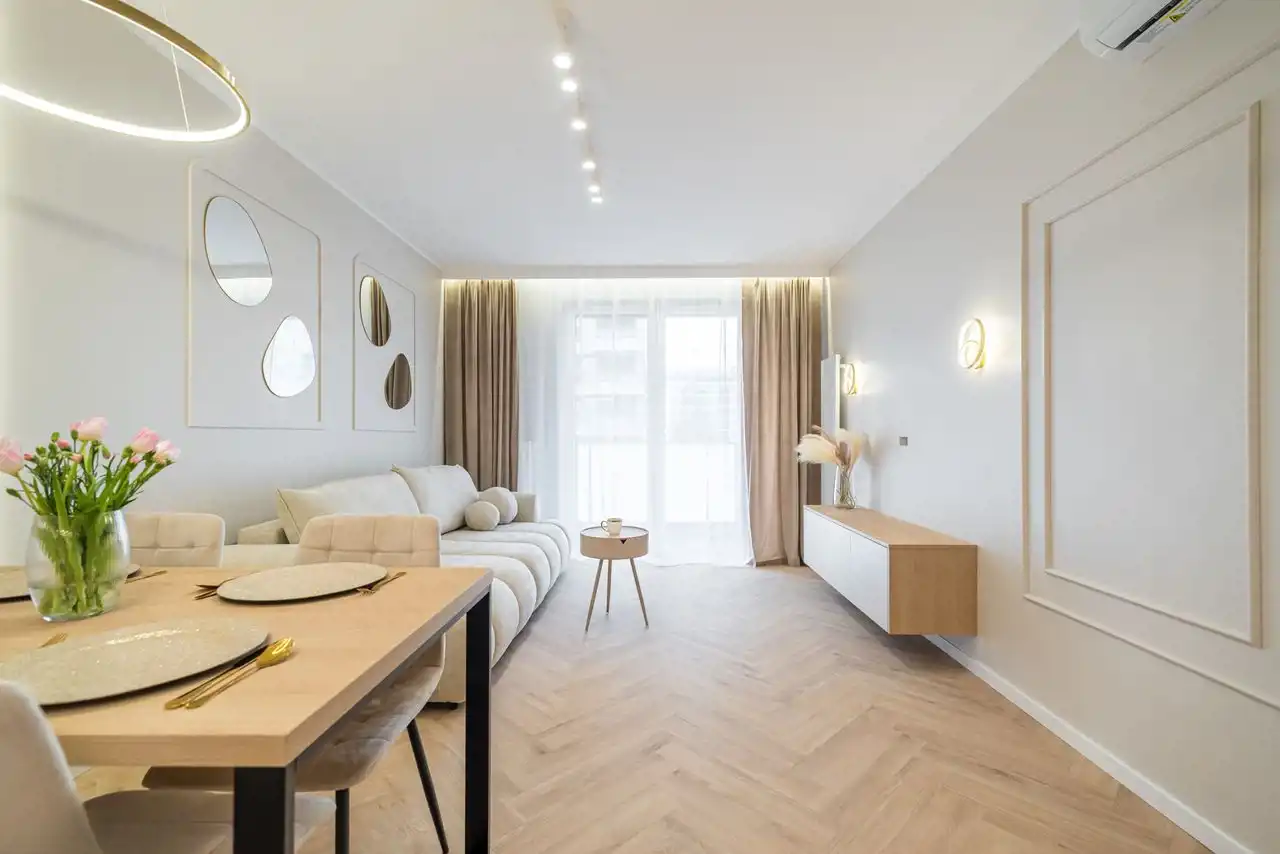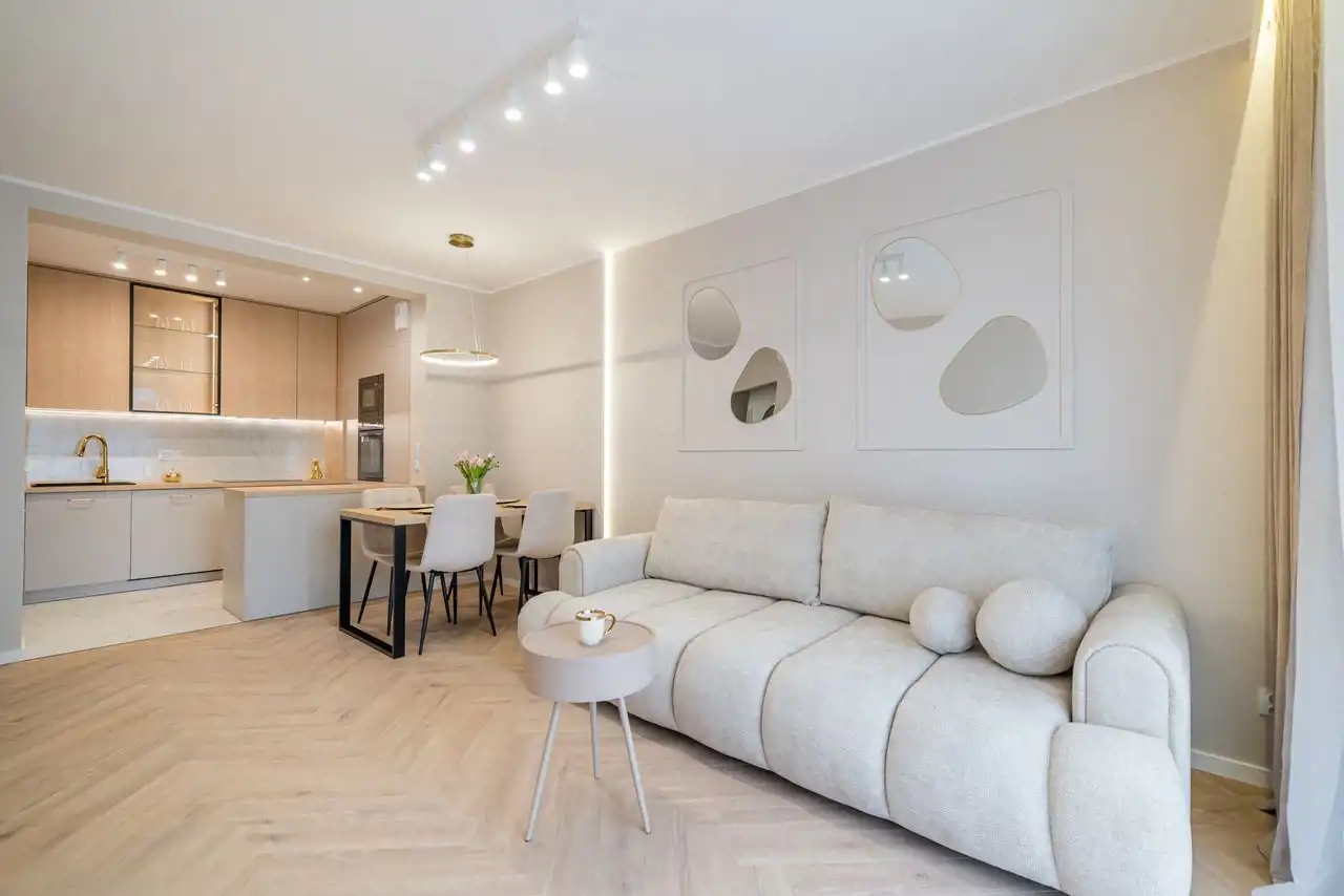 - w cenie meble ruchome: stół, krzesła, sofa z funkcją spania, łóżko 160 cm z pojemnikiem, stoliki nocne, stolik kawowy, lustra