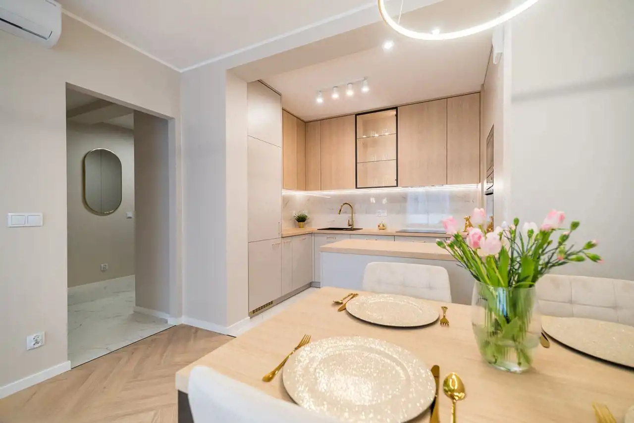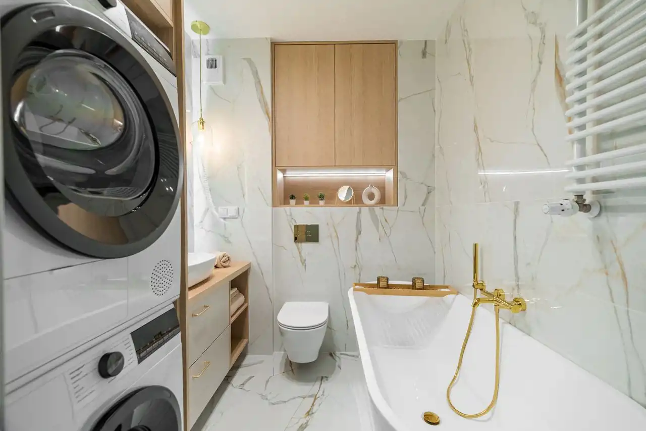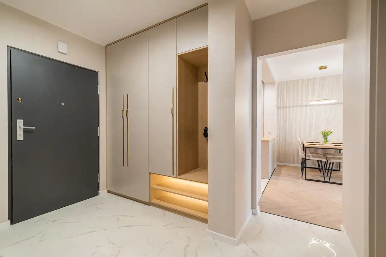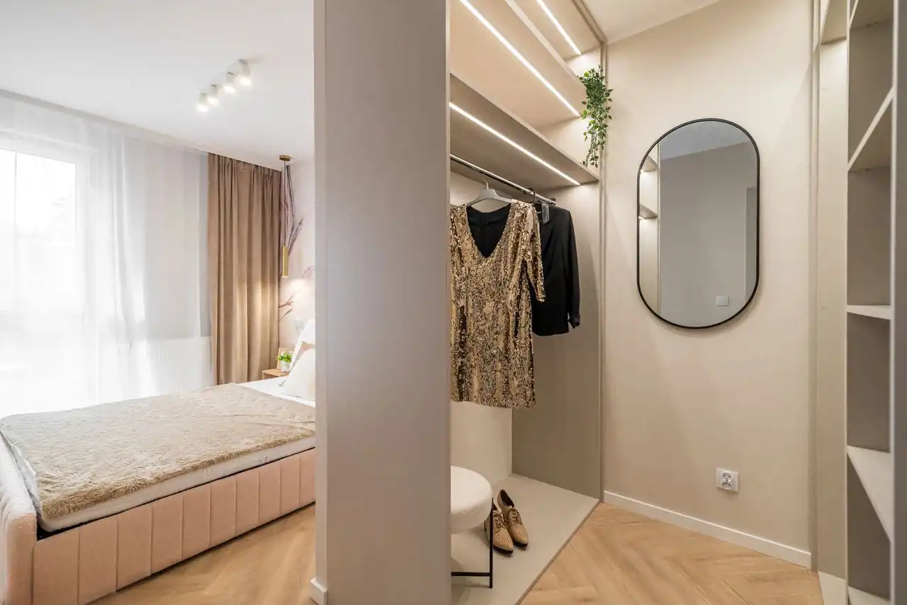 - zabudowy stolarskie wykonane na wymiar: kuchnia, szafa w przedpokoju z siedziskiem, garderoba w sypialni, zabudowa łazienkowa
