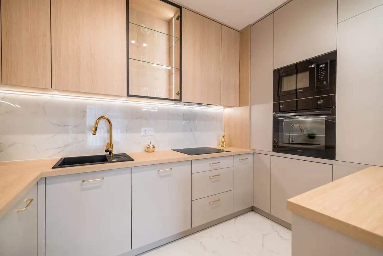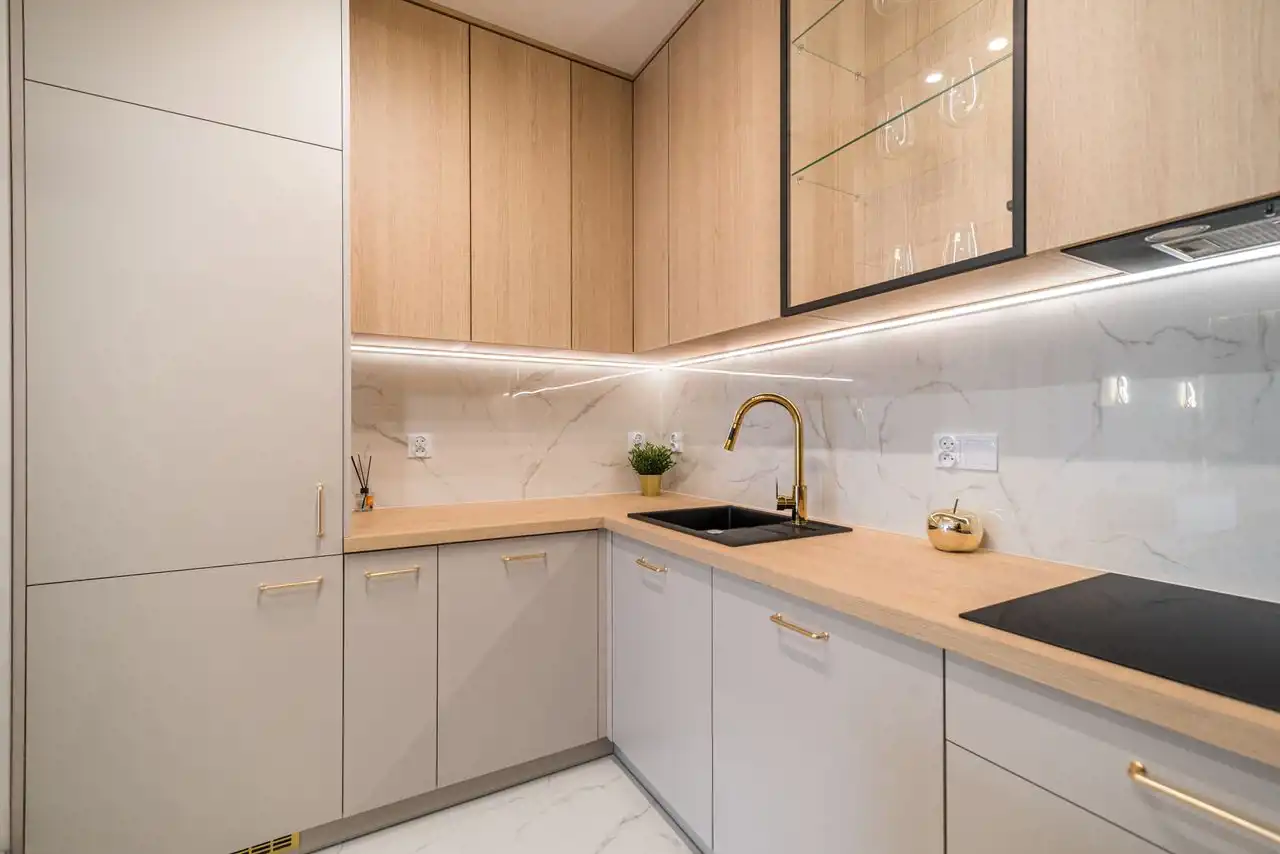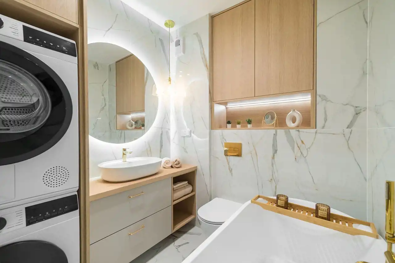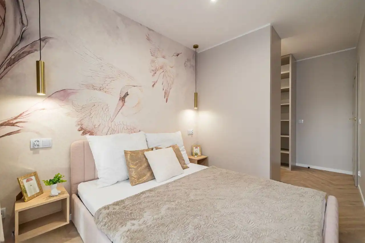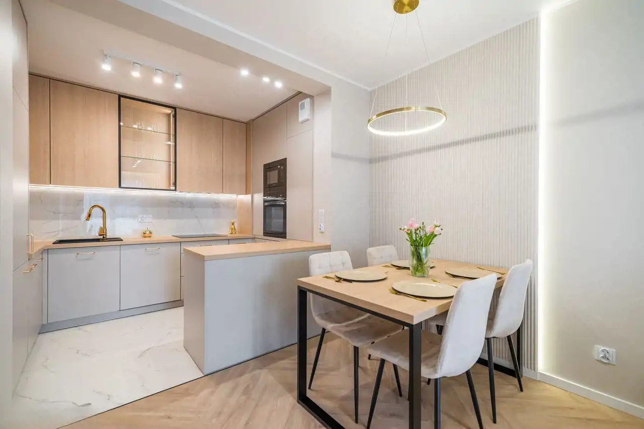 - zabudowy stolarskie wykonane na wymiar: kuchnia, szafa w przedpokoju z siedziskiem, garderoba w sypialni, zabudowa łazienkowa