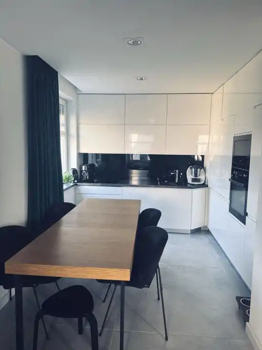 Kuchnia jest w pełni wyposażona: lodówka, piekarnik, płyta indukcyjna, zmywarka i okap. Jasne fronty i wysoka zabudowa na wymiar nadają elegancki charakter i maksymalizują funkcjonalność przestrzeni.