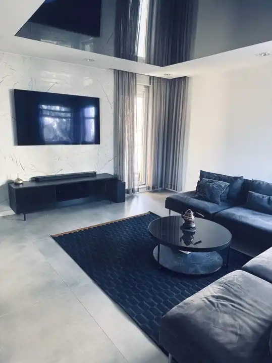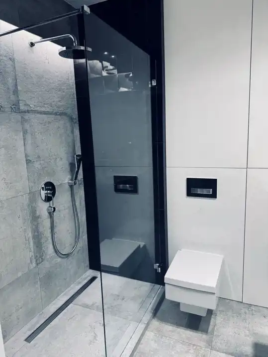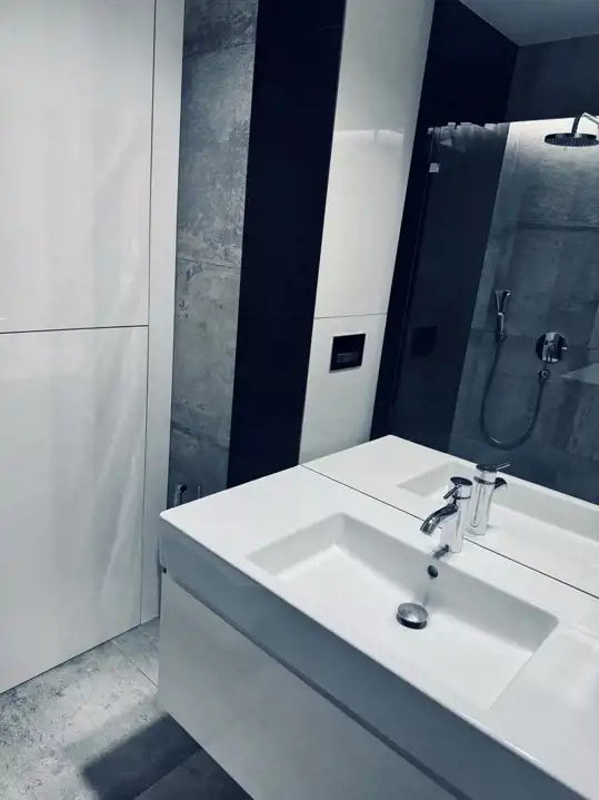Łazienka została wykończona w wysokim standardzie. Kabina prysznicowa i elegancka zabudowa tworzą harmonijną i praktyczną przestrzeń, a nowoczesne materiały dodają wnętrzu stylu.