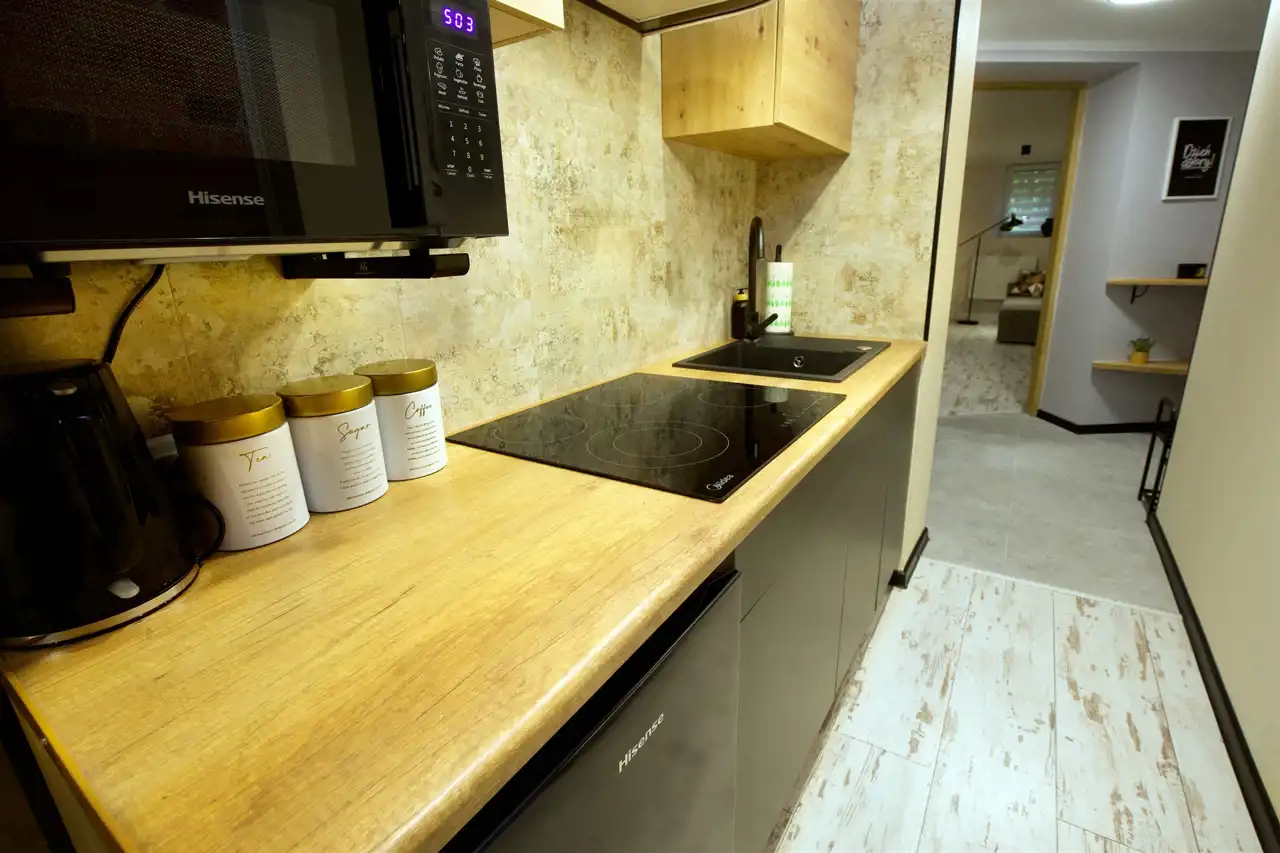 -w pełni wyposażone aneksy kuchenne (lodówka, płyta, czajnik, ekspres, naczynia)