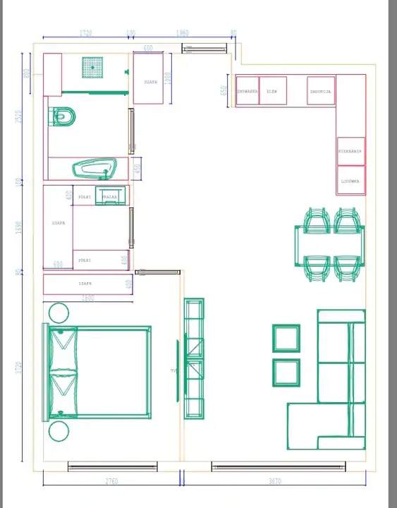 lodówka, zmywarka, płyta indukcyjna, piekarnik, okap.