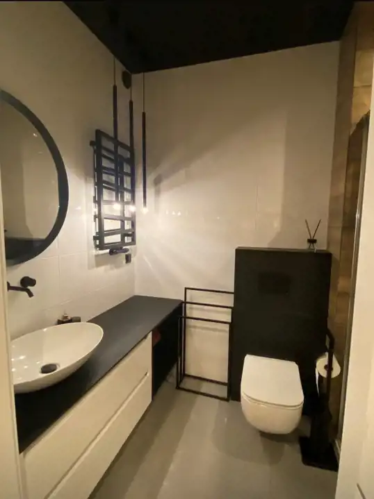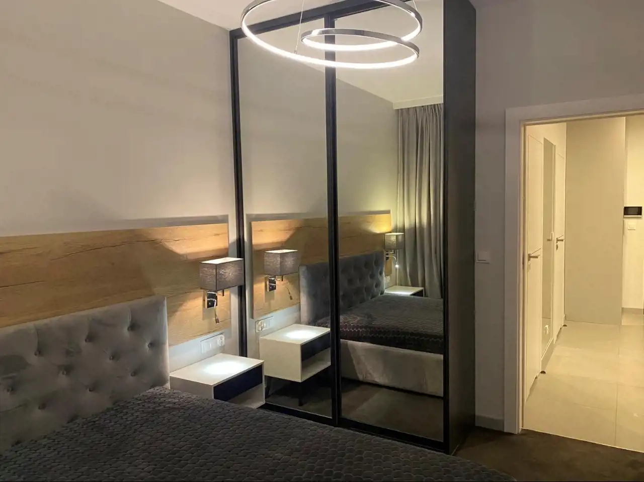 W mieszkaniu jest dużo luster oraz ciekawe rozwiązania oświetleniowe.