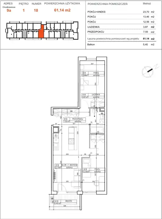 - Charakterystyka mieszkania 61.14 m2, 3 pokoje