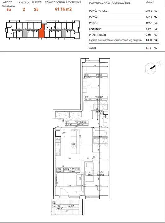 - Charakterystyka mieszkania 61.16 m2, 3 pokoje