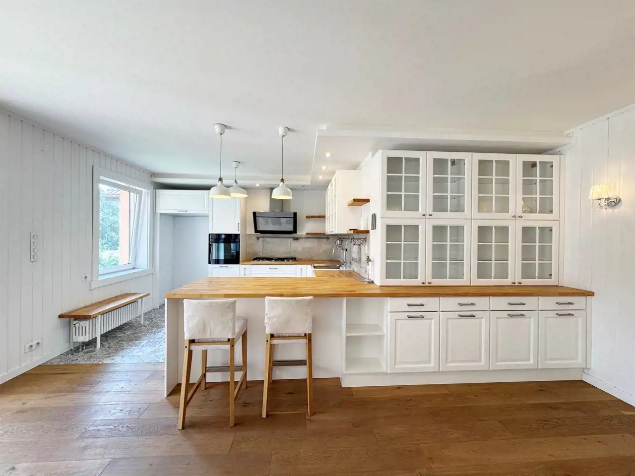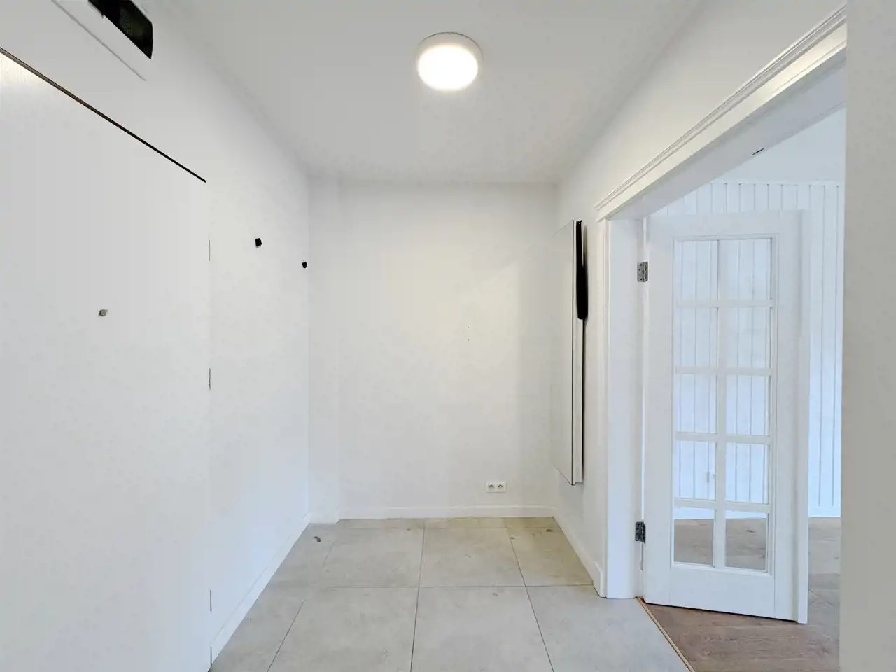 W przedpokoju wymieniono standardowy grzejnik na nowoczesny grzejnik ścienny o dekoracyjnym charakterze, który pełni także funkcję lustra, stanowiąc ciekawy i praktyczny akcent wystroju. Drzwi wewnętrzne wykonane są na zamówienie, z litego drewna. Zabudowa kuchenna zrobiona na wymiar. W przedpokoju zamontowano dekoracyjny grzejnik ścienny z funkcją lustra – praktyczny i estetyczny detal. Wszystkie zabudowy meblowe oraz drzwi zostały wykonane na zamówienie przez lokalnego stolarza.