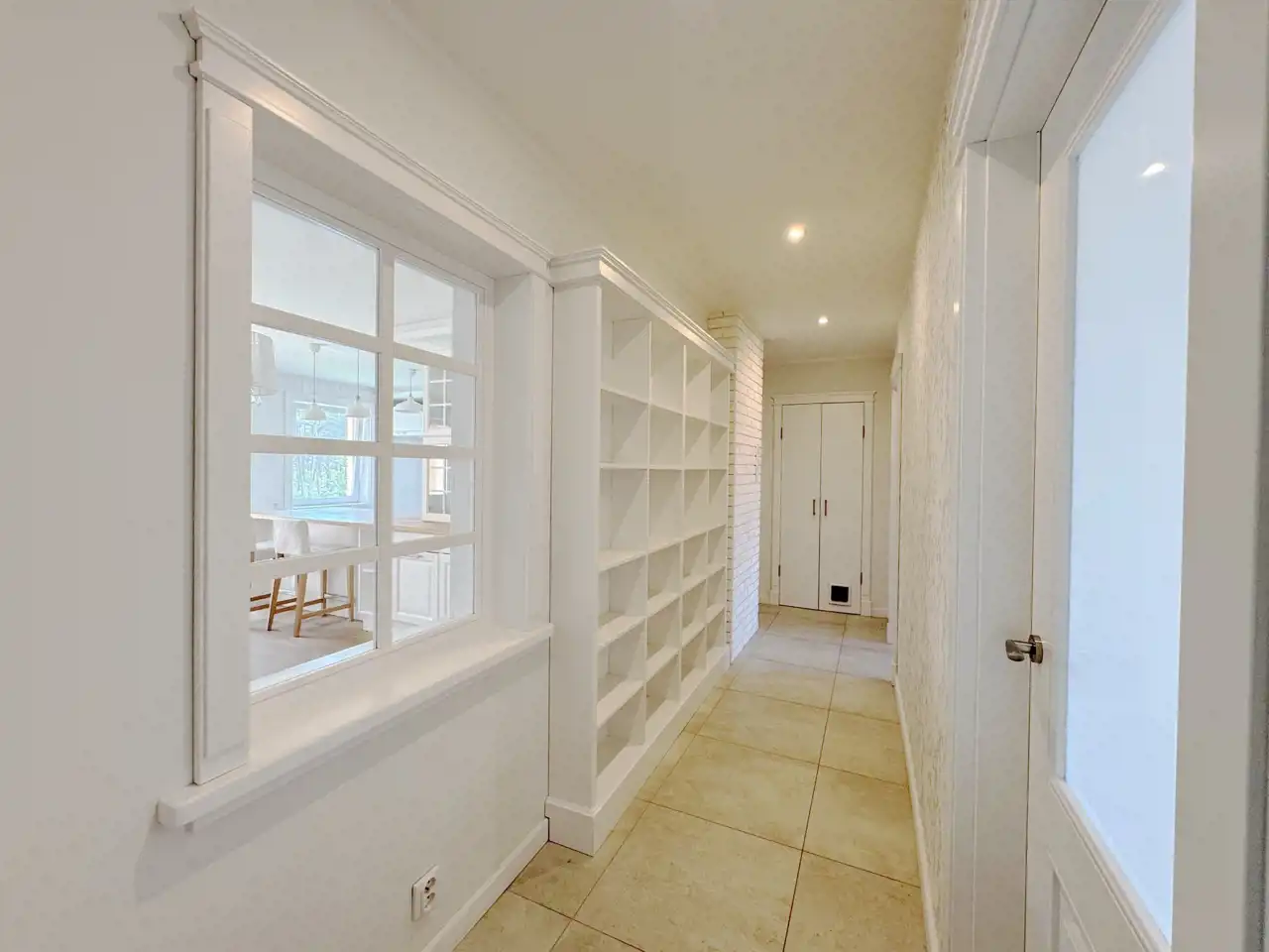 Przestronny korytarz o powierzchni 6,36 m² – z praktycznymi regałami i świetlikiem, który dodaje klimatu.