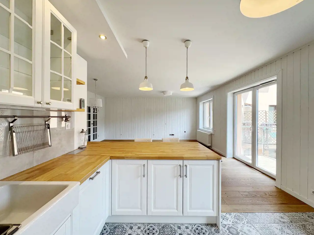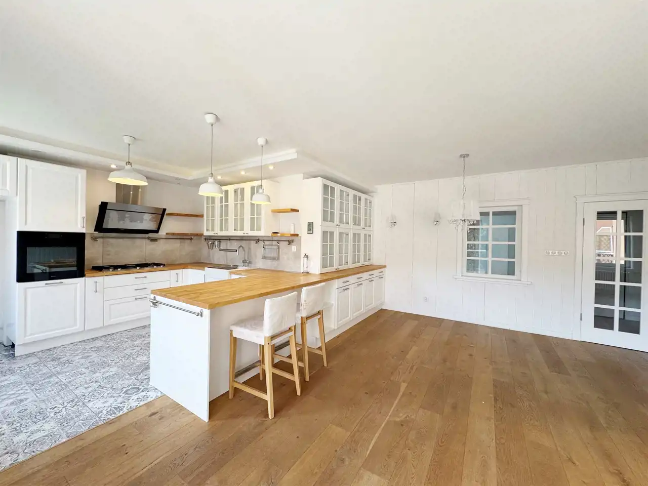 Salon z aneksem kuchennym i jadalnią o powierzchni 45,13 m² – przestronna, otwarta przestrzeń z dużą ilością naturalnego światła. Kuchnia w zabudowie, urządzona w stylu skandynawskim, z drewnianym blatem roboczym.
