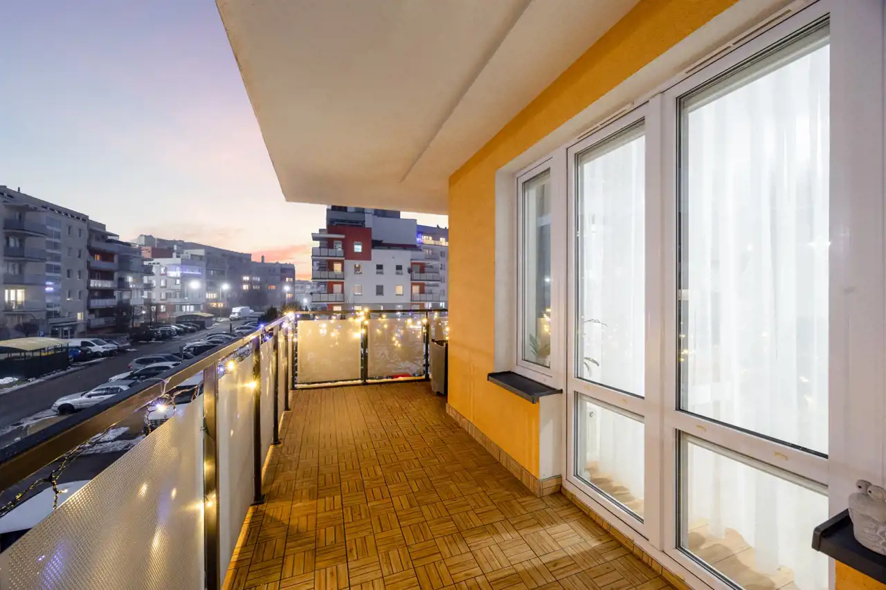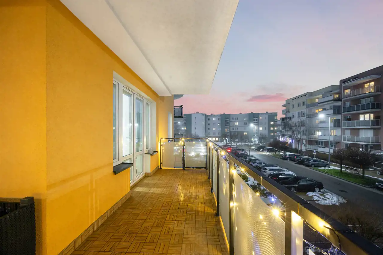 Mieszkanie posiada taras od strony wewnętrznej osiedla, co zapewnia ciszę, prywatność i komfortowy wypoczynek bez hałasu ulicznego.