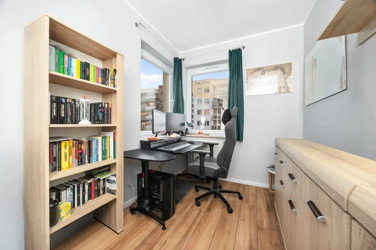 Osiedle jest zamknięte, monitorowane i bardzo dobrze utrzymane. Dodatkowym atutem jest nowoczesny plac zabaw dla dzieci. Jeśli masz małe dziecko, to ogromna wygoda – bezpieczna przestrzeń do zabawy znajduje się tuż pod domem.