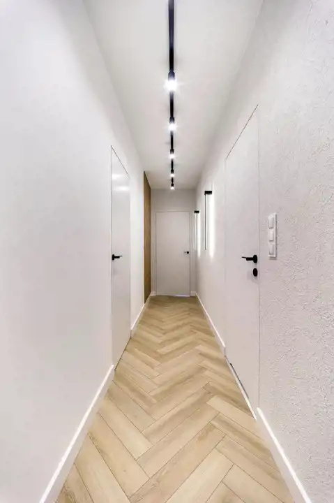 Wnętrze jest jasne i dobrze doświetlone naturalnym światłem. Wyposażenie wysokiej jakości począwszy od podłóg, oświetlenia, przez stolarkę drzwiową aż po zabudowy i wyposażenie.