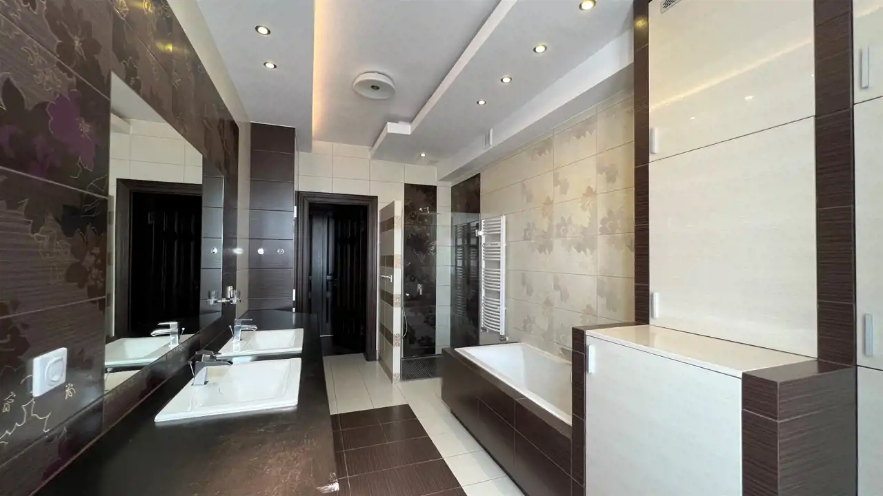 Duża, jasna łazienka z wanną i prysznicem