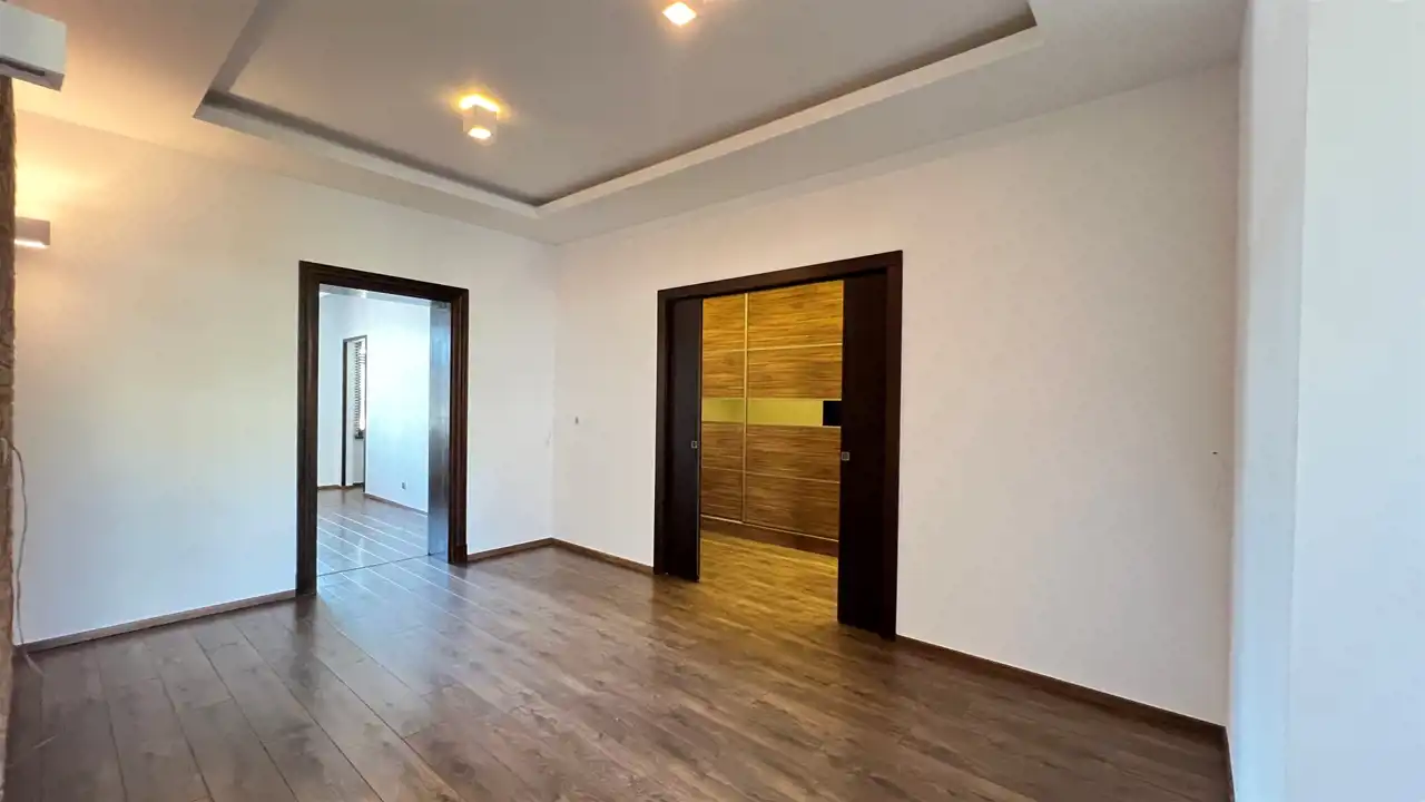 Drewniane panele na podłogach i gładzie na ścianach