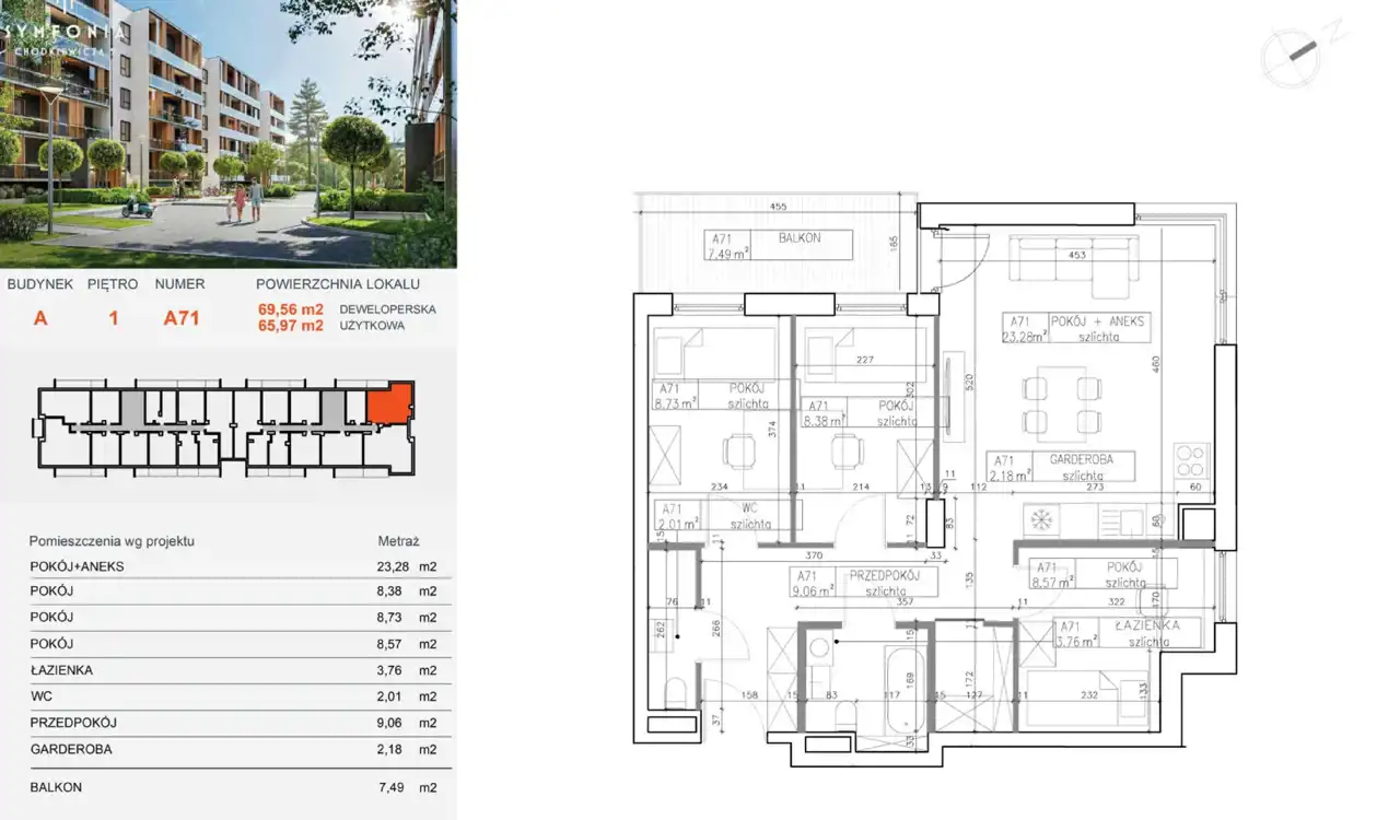 Mieszkanie o powierzchni 65,97 m2 składa się z: