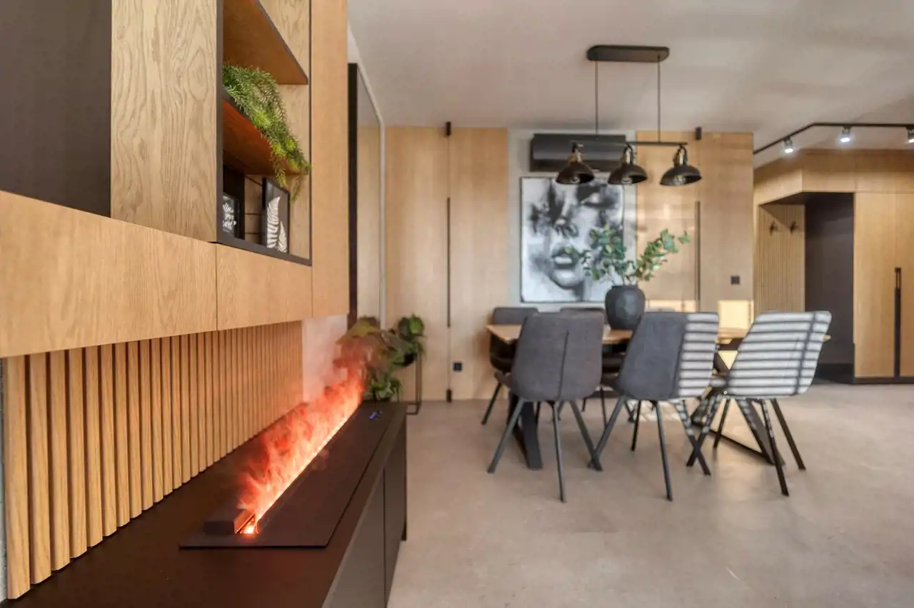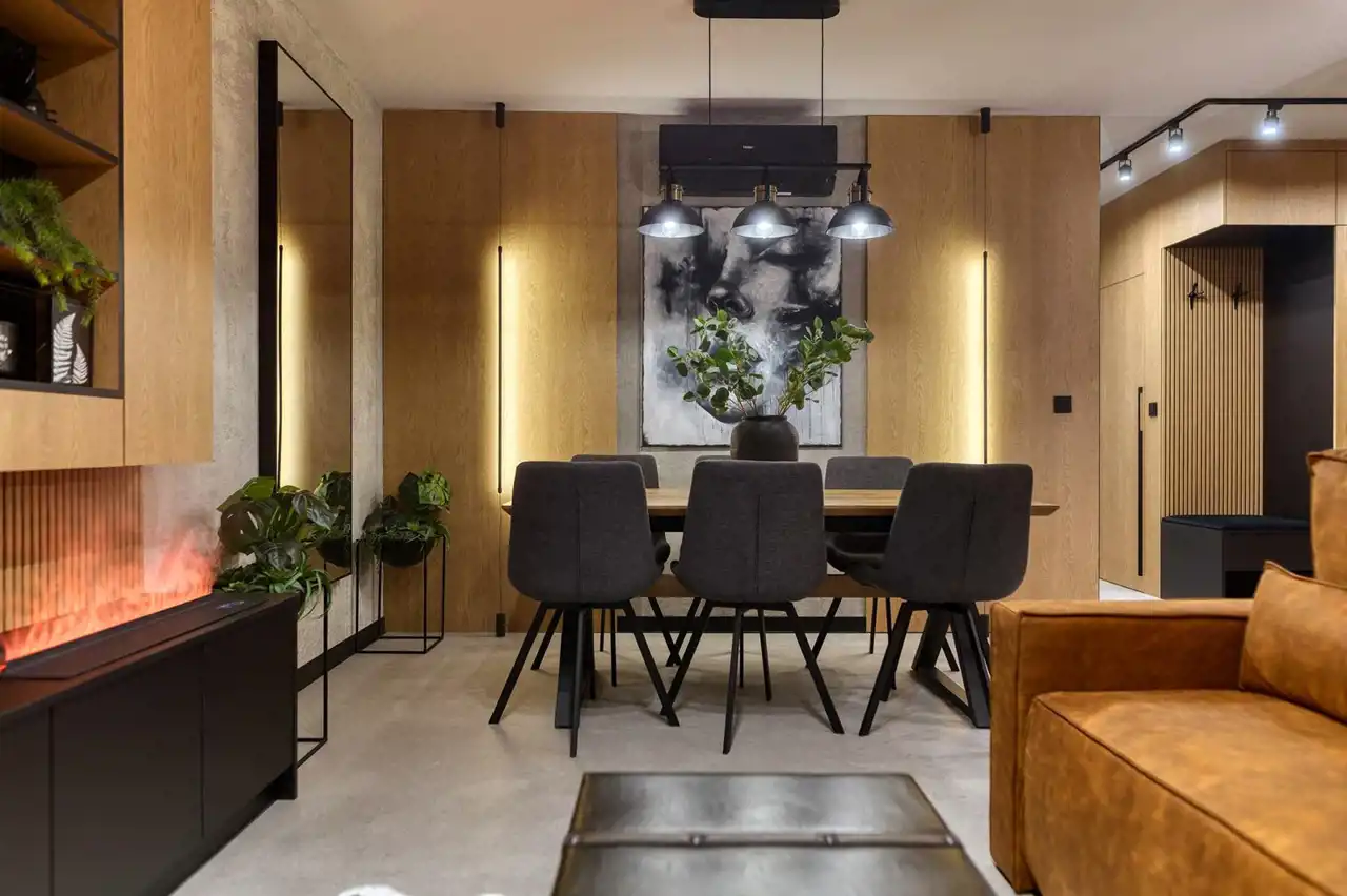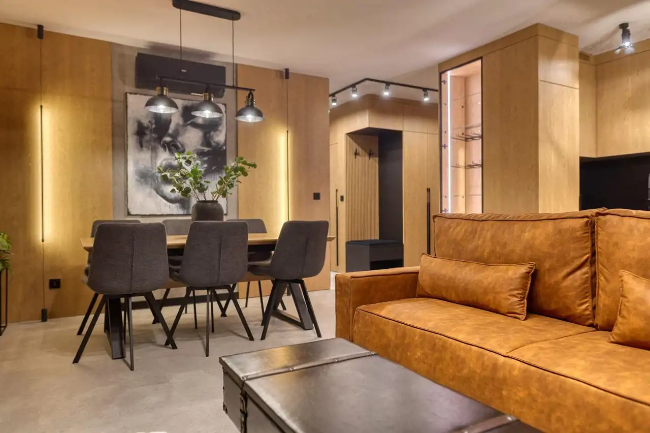 Część dzienna urządzona została m.in. w rozkładaną sofę, elegancki stół, designerskie obrotowe krzesła, stolik kawowy oraz kominek, który nadaje wnętrzu wyjątkowej, luksusowej atmosfery.
