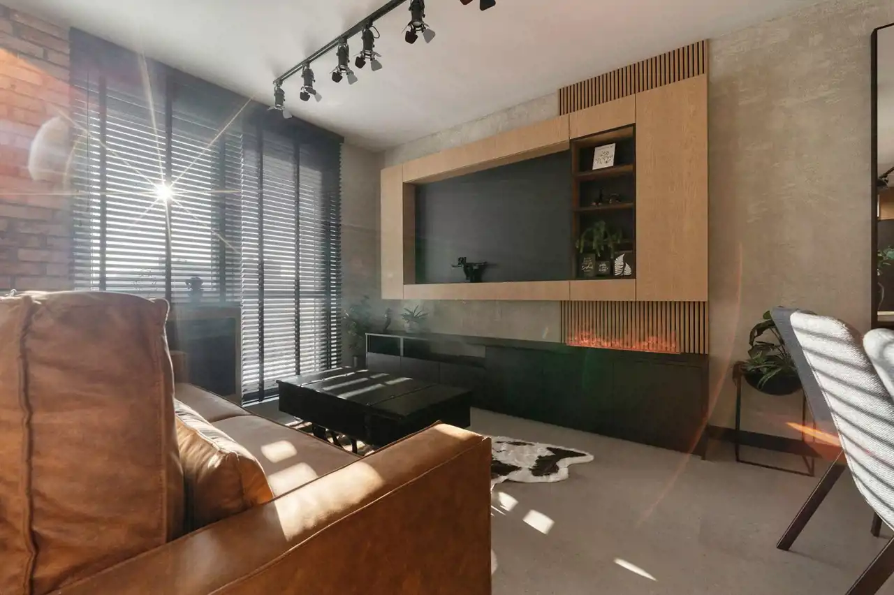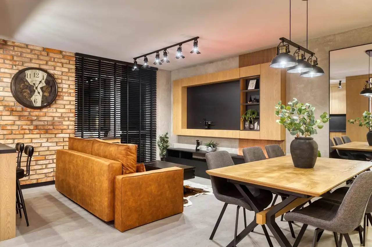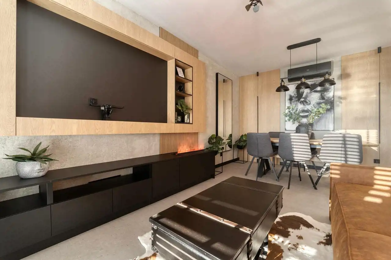 Część dzienna urządzona została m.in. w rozkładaną sofę, elegancki stół, designerskie obrotowe krzesła, stolik kawowy oraz kominek, który nadaje wnętrzu wyjątkowej, luksusowej atmosfery.