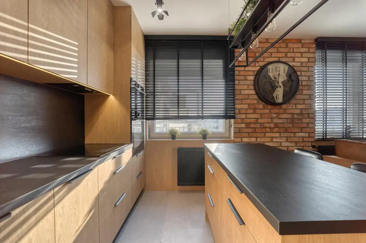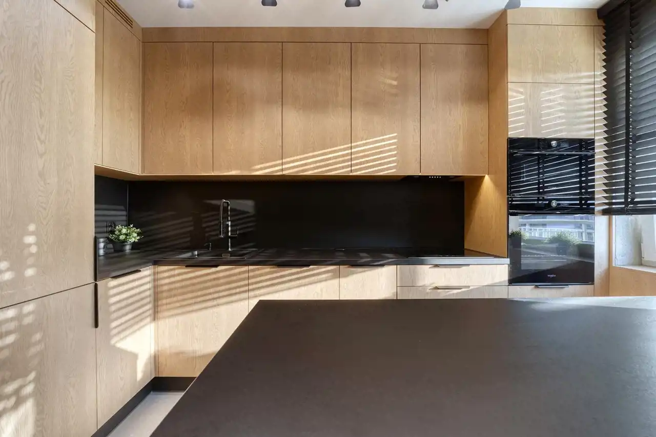 Kuchnia wykonana w zabudowie na wymiar, wyposażona w komplet wysokiej klasy sprzętów AGD: lodówkę, zmywarkę, piekarnik, kuchenkę mikrofalową, okap oraz płytę indukcyjną.