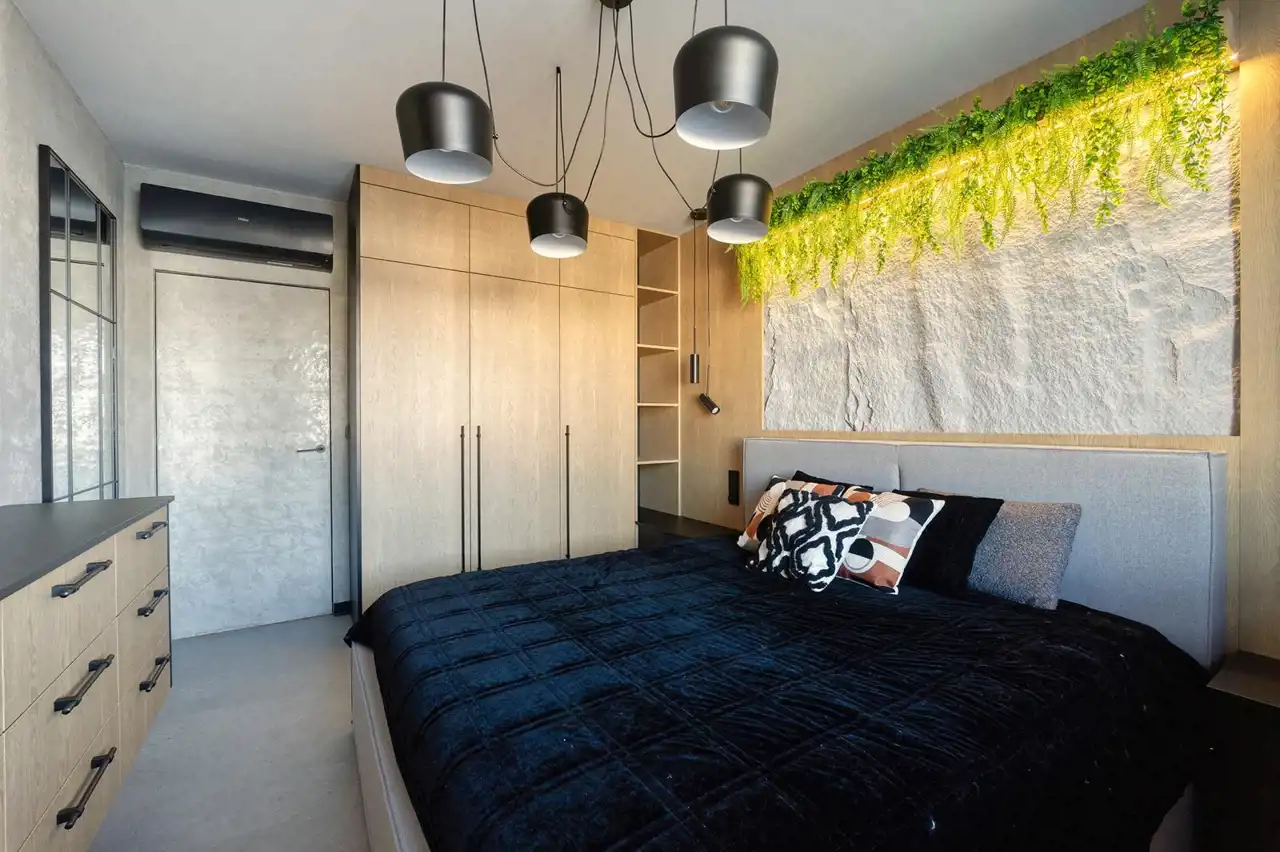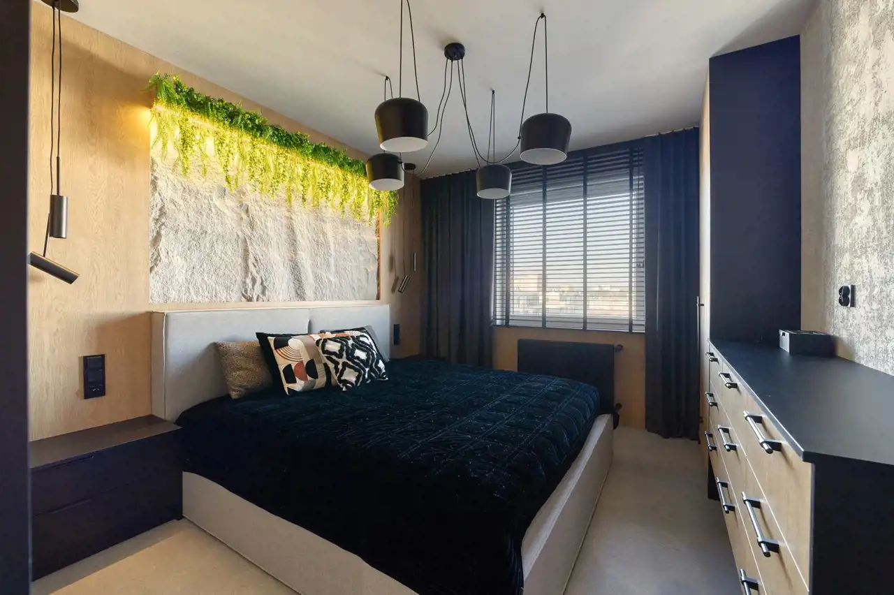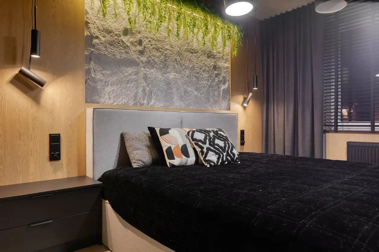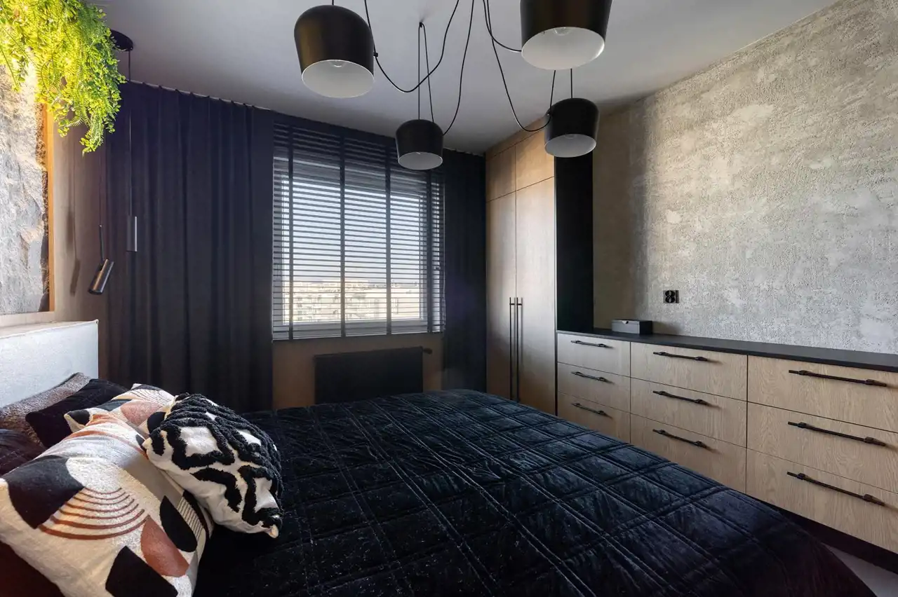 Wyposażona w łóżko typu king size (180 cm) z pojemnikiem i wysokiej klasy materacem, pojemne szafy oraz komodę wykonaną na zamówienie. -