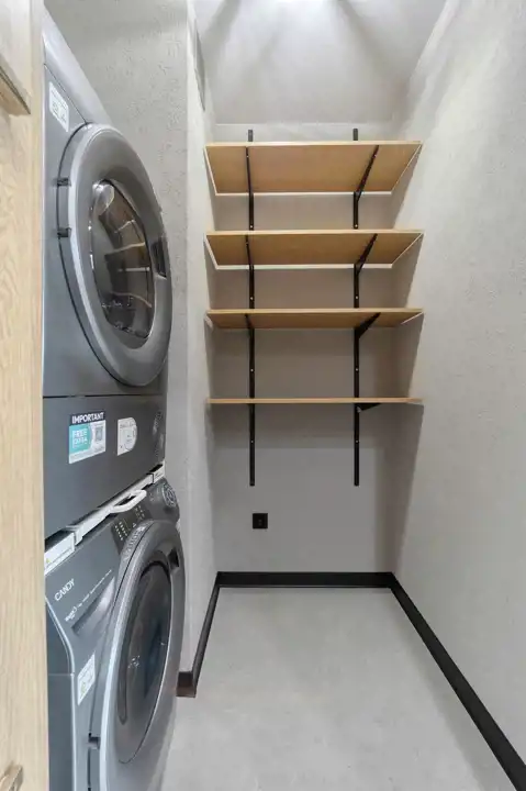 Wyposażona w pralkę, suszarkę oraz zabudowę do przechowywania.
