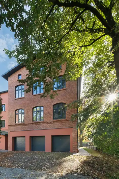 Uwagę przykuwa pięknie odnowiona cegłę i duże okna.