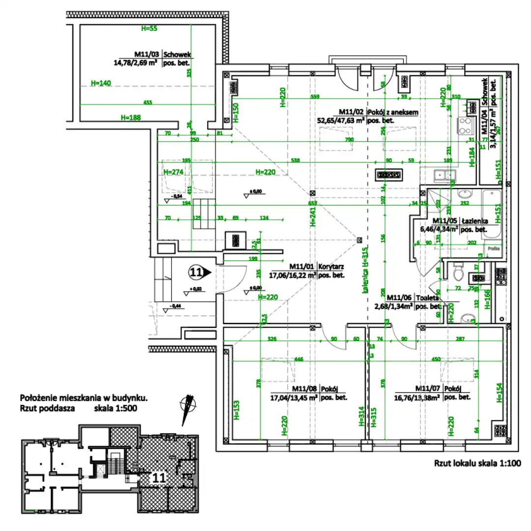 Pomieszczenia są wysokie - przekraczają 3 metry wysokości.