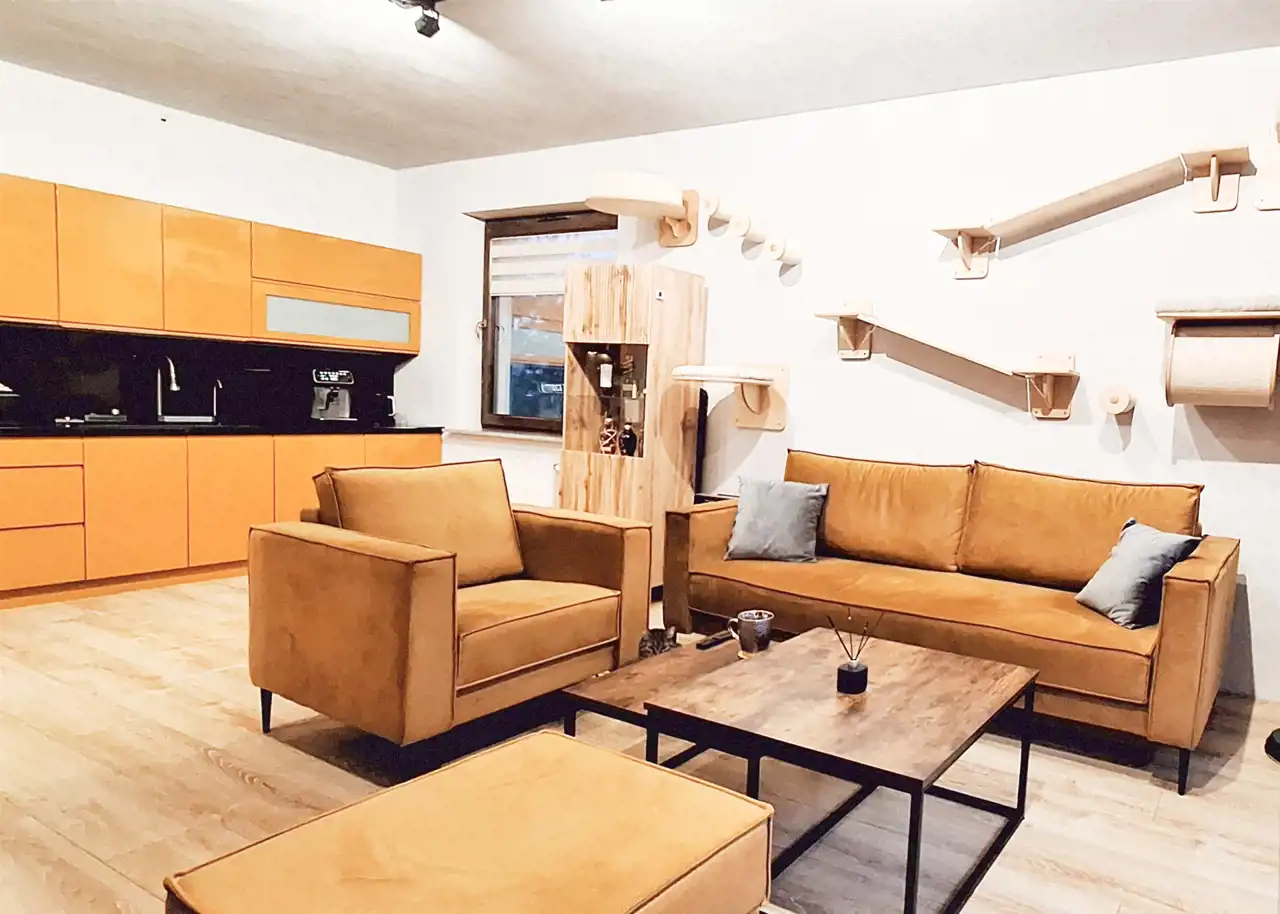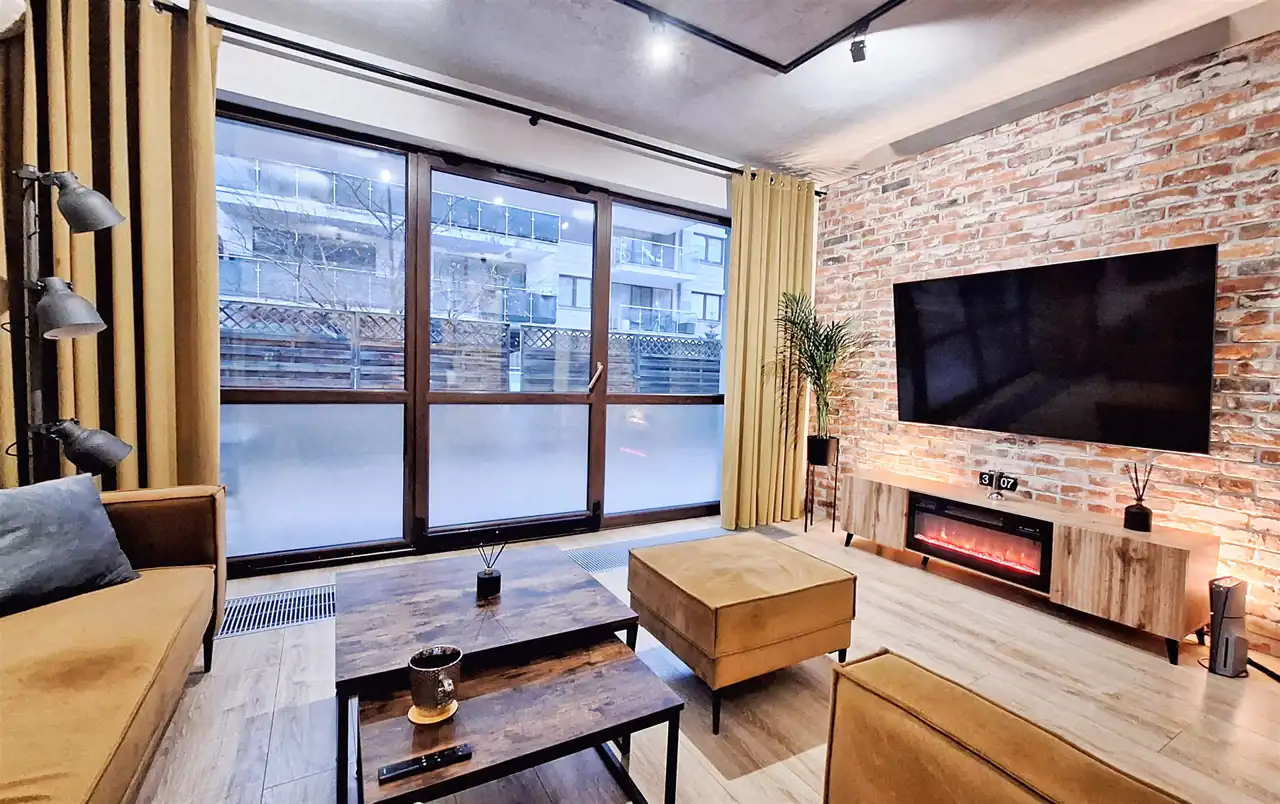 Wygodna część wypoczynkowa jest przytulna i przestrzenna. Elektryczny kominek i cegły na ścianie tworzą przytulny klimat.