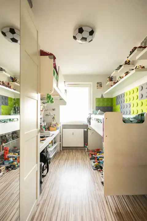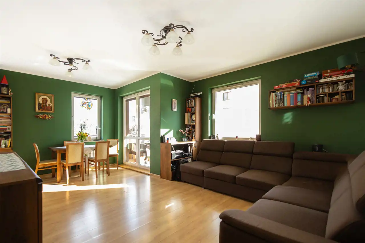 Sercem tego 81-metrowego mieszkania w Bydgoszczy jest przestronny, idealnie nasłoneczniony salon (22,8m2). To właśnie tutaj toczy się życie rodzinne, a dzięki dużym przeszkleniom w wyjątkowy sposób zaciera się granica między wnętrzem a przyrodą na zewnątrz. Znajdziesz tu przestrzeń na ogromny rozkładany stół, przy którym ugościsz przyjaciół i najbliższych, czy dużą, wygodną kanapę. To właśnie z tego pomieszczenia wyjdziemy na pierwszy z dwóch słonecznych tarasów. Te dodatkowe 12m2 na świeżym powietrzu to naprawdę idealne miejsce do wypicia porannej kawy czy popołudniowego relaksu.