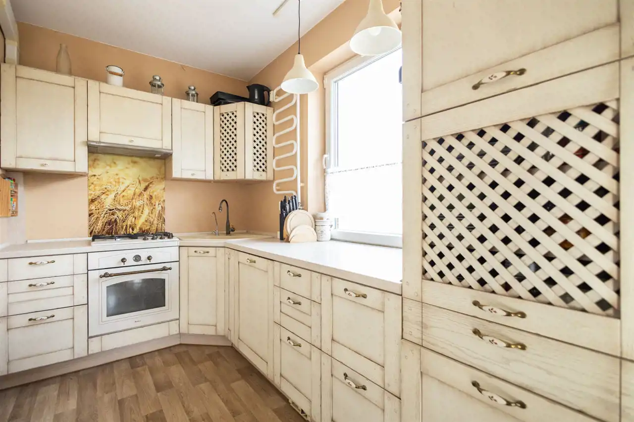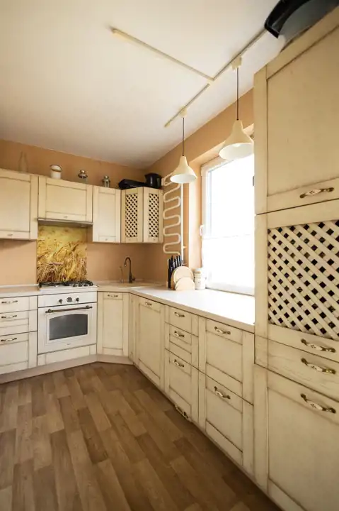 Salon w płynny sposób łączy się z - zamykanym nowoczesnymi, przesuwnymi drzwiami - aneksem kuchennym (ok. 7,5m2) utrzymanym w przytulnym, rustykalnym stylu. Te wyjątkowe meble nadają całemu domowi niepowtarzalnego, prawdziwie ciepłego klimatu. Duży blat roboczy i wszystkie sprzęty AGD w cenie to zalety, na które zwraca uwagę większość kupujących. Zastosowanie w kuchni eleganckich drzwi przesuwnych to strzał w dziesiątkę - sam decydujesz, czy chcesz cieszyć się otwartą przestrzenią (aneks), czy wolisz dyskretnie oddzielić strefę gotowania od strefy wypoczynkowej (osobna kuchnia).
