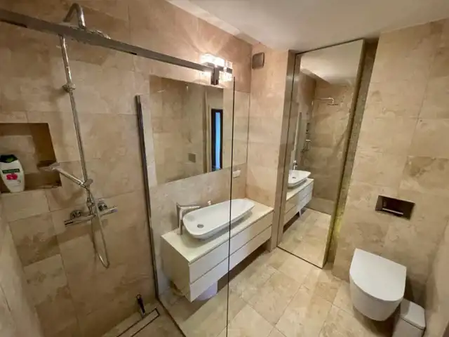 Łazienka- wykończona w trawertyn naturalny, większa kabina prysznicowa, szafki w zabudowie.