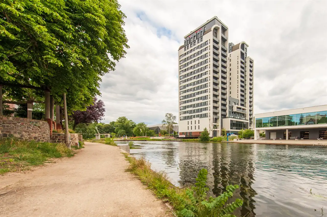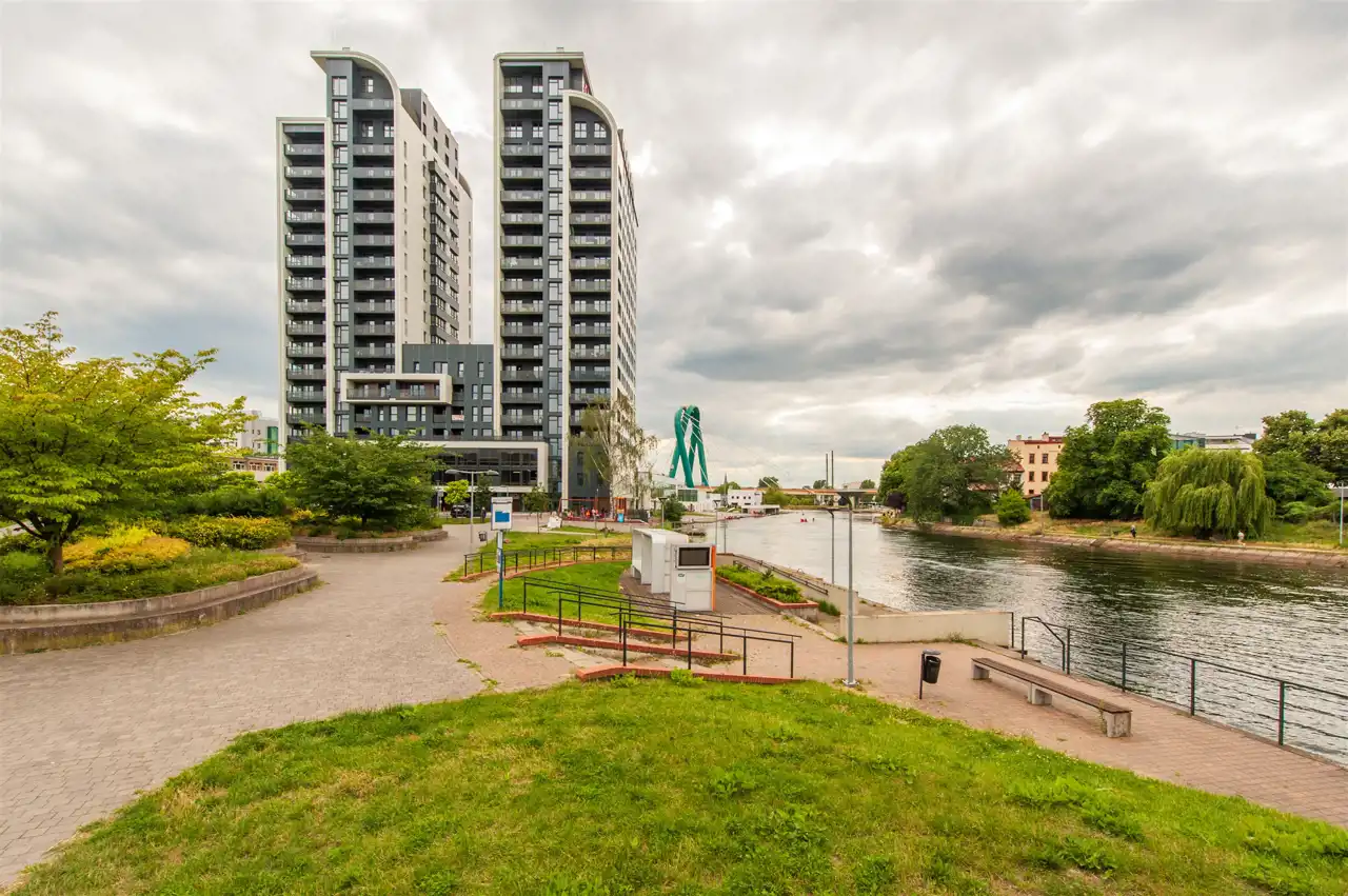 Prestiżowa lokalizacja, nowoczesny, dobrze wyposażony budynek stał już się nowym symbolem Bydgoszczy, który zdefiniował pojęcie luksusu, zapewni sukces i odzwierciedli aspiracje mieszkańców. Przepiękne otoczenie rzeki gwarantuje bliskość terenów spacerowych. Z drugiej strony - mimo, że wśród zieleni, nadal jesteśmy w samym centrum miasta. Blisko stąd do centrów handlowych Focus Mall i ważnych węzłów komunikacyjnych. Obok znajduje się rondo Toruńskie, trasa Uniwersytecka, dworzec PKS, przystanki tramwajowe i autobusowe, hala sportowo widowiskowa „Łuczniczka” gdzie organizowane są różne imprezy, oraz słynne lodowisko TORBYD. Do ścisłego centrum jest stąd zaledwie kilka minut spacerem. W pobliżu inwestycji znajdują się restauracje oraz hotele, obiekty sportowe i kulturalne, szkoły i kina. Okolica zapewnia bezpośredni dostęp do niezwykłych miejsc takich jak muzea czy filharmonia. Charakterystyka okolicznej zabudowy jest gwarantem, że w bezpośrednim sąsiedztwie nie powstanie już inny podobny budynek, co z kolei gwarantować będzie niezwykłe widoki na panoramę miasta.