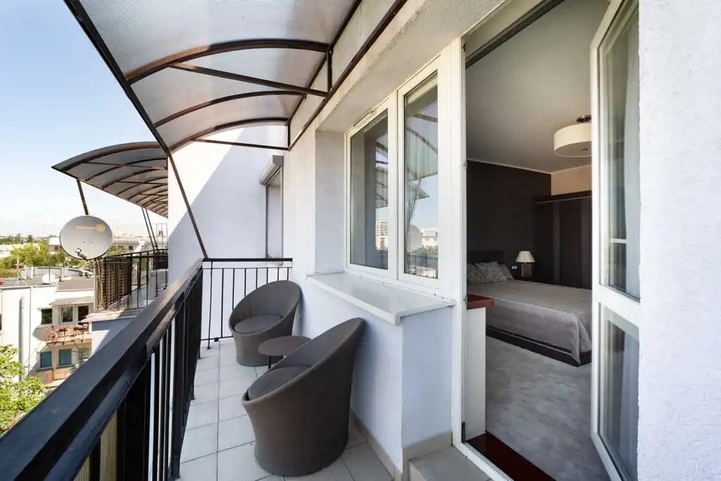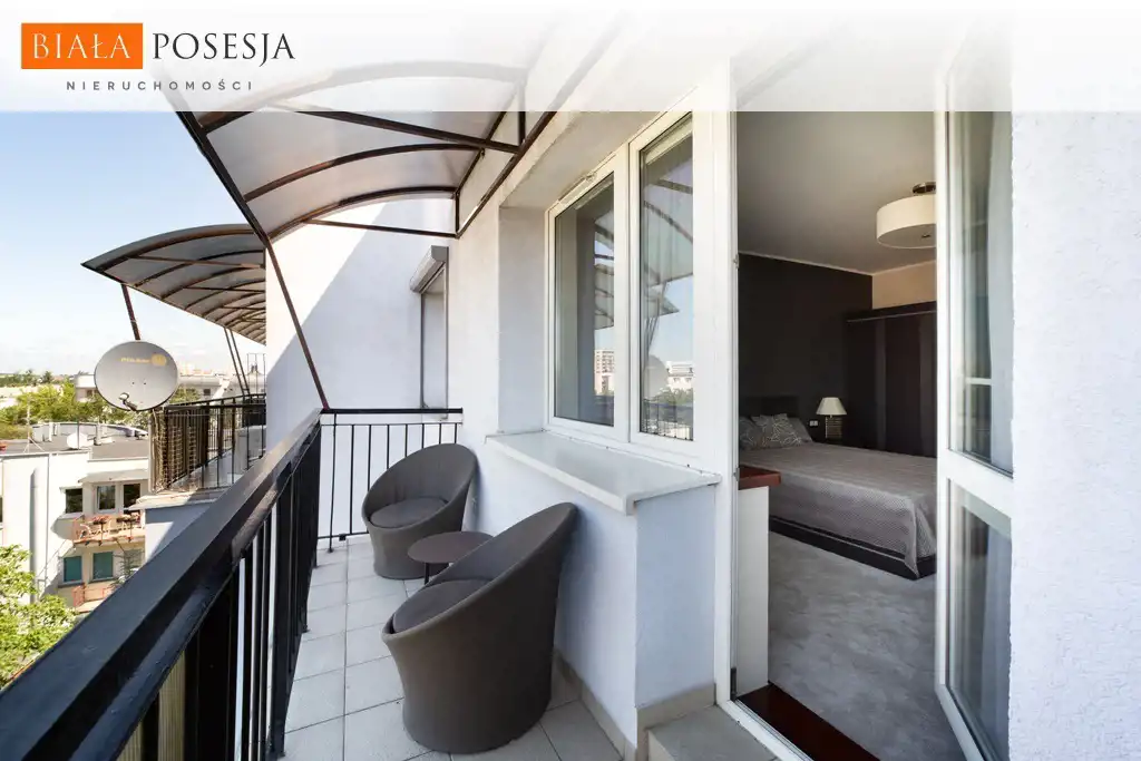 Z salonu i jednej z sypialni wyjście na balkon typu loggia z widokiem na zachód słońca.